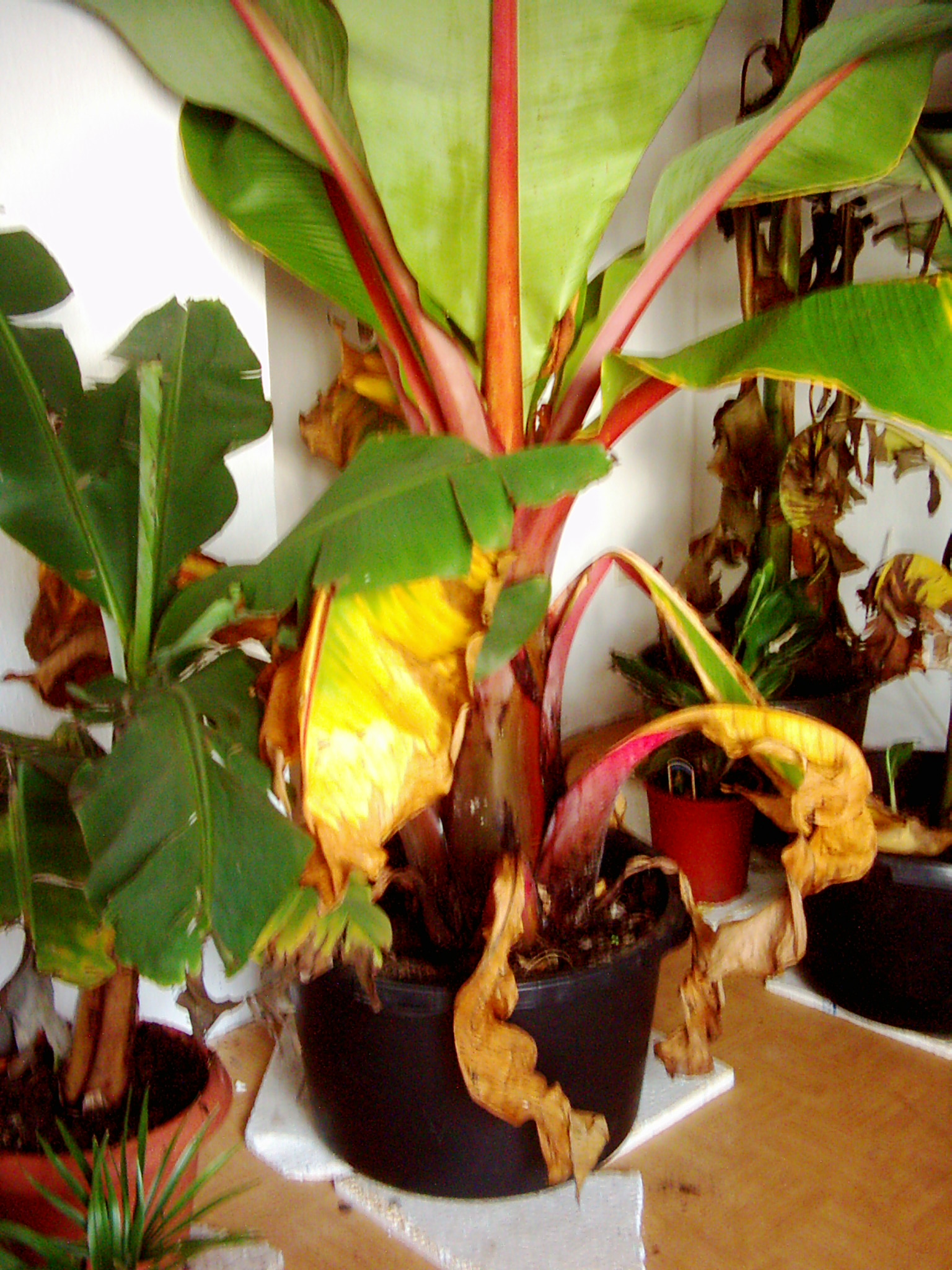also, ich habe mir Im Sommer eine Ensete ventricosum Maurellii zugelegt, die hat wunderschöne rote Blätter, einen schönen Scheinstamm und einen Topf, der ihr verbietet gigantisch zu werden , na auf jeden Fall bis nächstes Jahr
