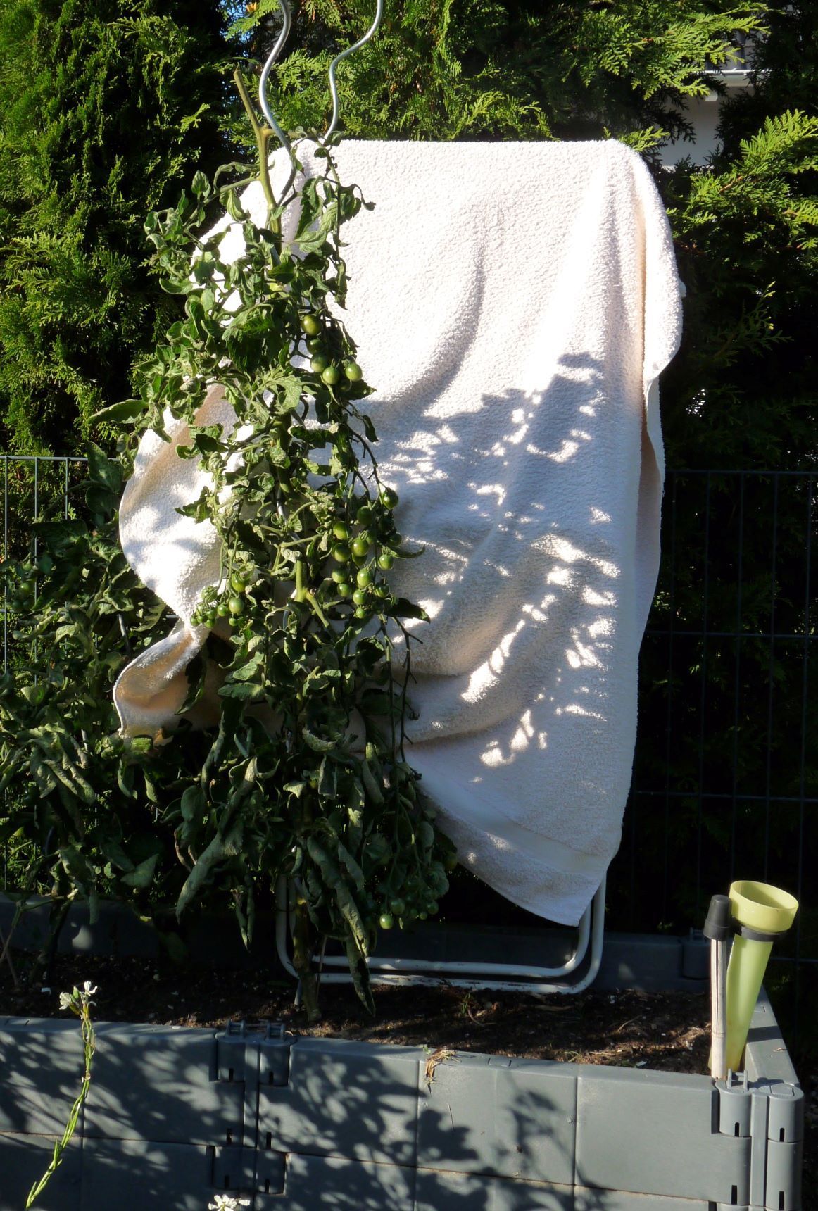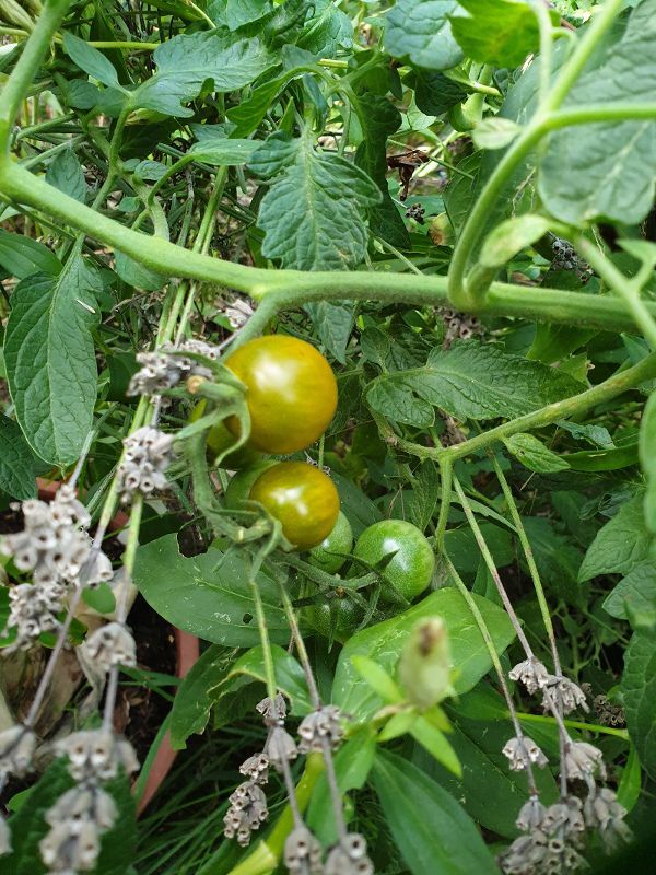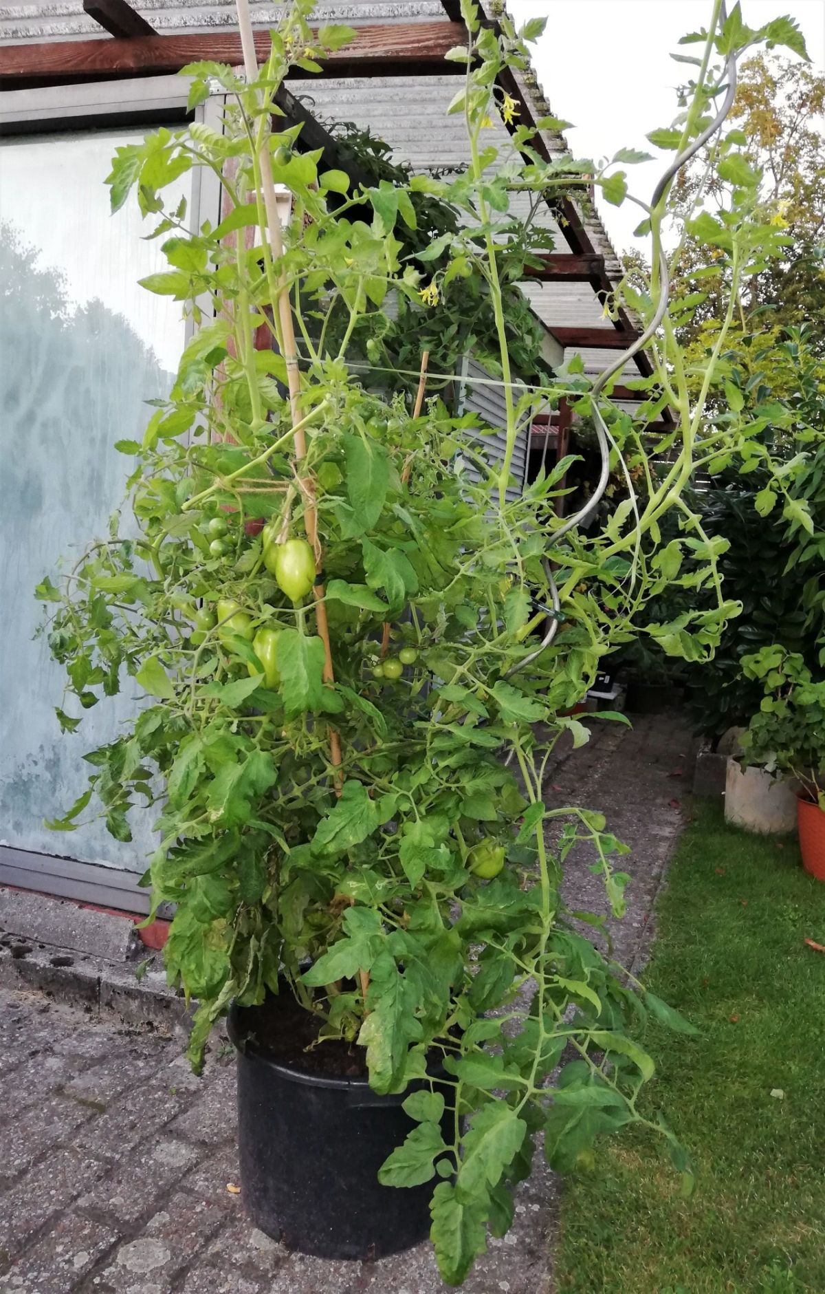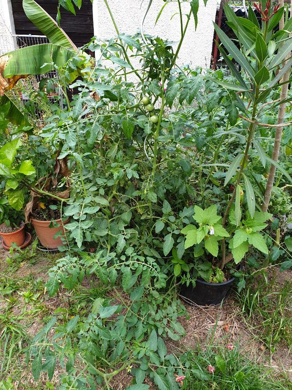 (Ich habe auch noch 2 Pflanzen im GW; die melde ich aber zum Wettbewerb nicht an: sind komplett mit anderen Tomaten und Gurken „verwurstet“, was ein Foto unmöglich machte...)