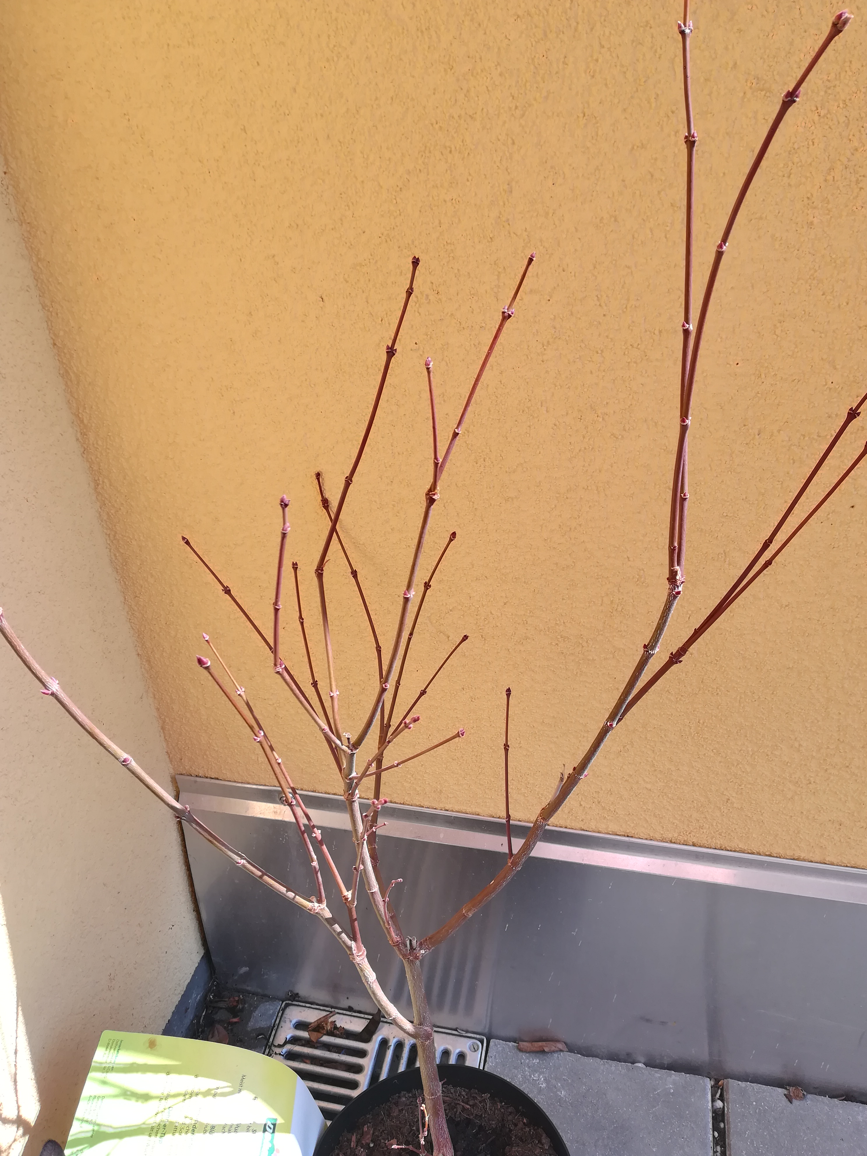 Jetzt steht er seit ca. 3 Wochen am Balkon und genießt die Frühlingssonne, jedoch kommen keine Blätter. Die Knospen hat er schon seit Wochen und gewachsen ist er auch.