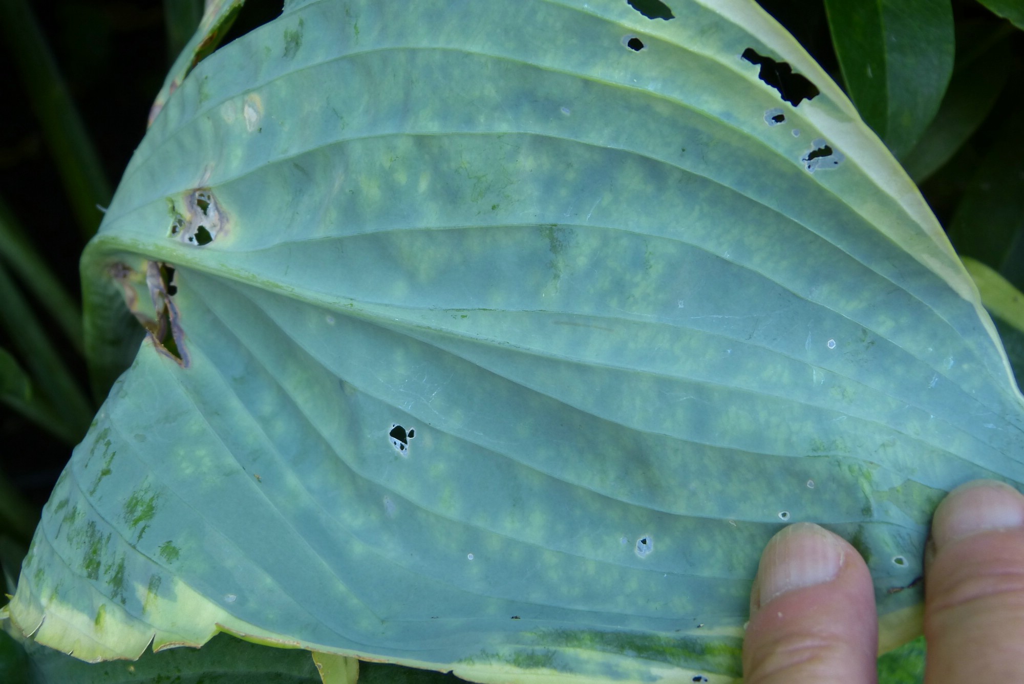 Als ich heute meine Hostas in Augenschein genommen habe, traf mich fast der Schlag: auch "Blue Mouse Ears" hat merkwürdige fleckig-unscharfe helle Verfärbungen entlang der Blattrippen, die von unten gegen das Licht betrachtet durchscheinend sind... Kurzer Abgleich mit Bildern aus dem Netz, und ja, kein Zweifel möglich. Und diese Hosta steht seit vorletztem Jahr im Beet! Gekauft bei P....... K....! (Fotos beider Pflanzen siehe im nächsten Post, irgendwie kann ich gerade keine anhängen...)