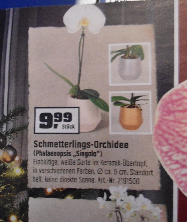 Ein bekannter Baumarkt mit einem Biber wirbt gerade mit einer Orchideen-Sorte, die nur eine einzige Blüte hat. Die "Sorte" heißt angeblich "Singolo" und macht an einem Blütentrieb eine einzige große Blüte.
