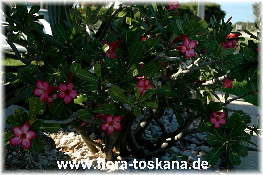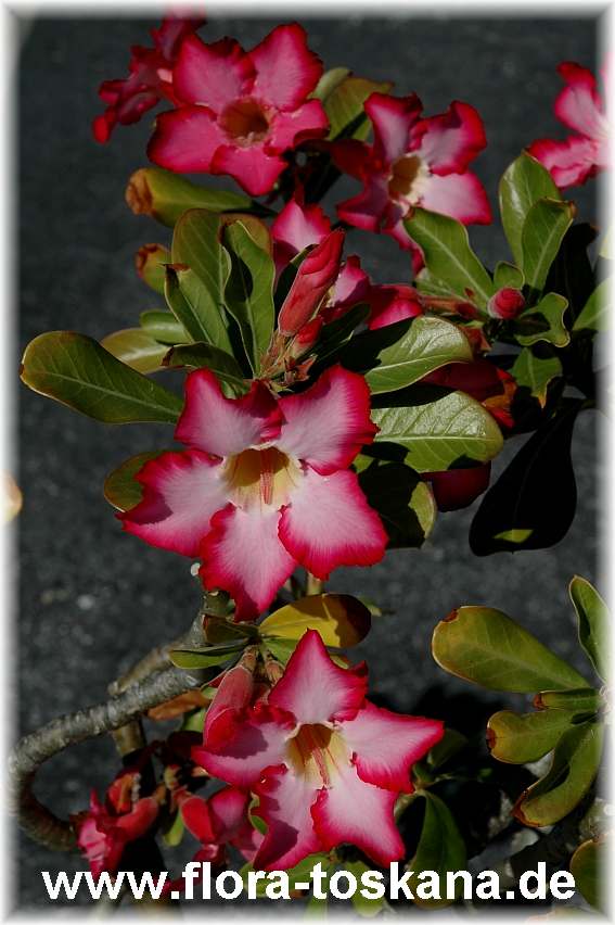 Der graue, verdickte Stamm mit den glänzend grünen Blättern lässt zunächst nicht vermuten, was in diesen genügsamen Wüstenpflanzen steckt: Den ganzen Sommer über öffnen sich bis zu 8 cm lange, je nach Sorte (Veredelung) rosafarbene, rote oder weiße Trichterblüten, die in dichten Büscheln an den Triebspitzen zusammenstehen. Im Winter sollte man den wasserspeichernden Pflanzen (Sukkulente) eine Trockenpause gönnen, während der das Laub fällt. Wintergartenbesitzer können diese Trockenzeit auch in die Sommermonate legen ? und dann im Winter bei Temperaturen über 15 °C die Blüte genießen.