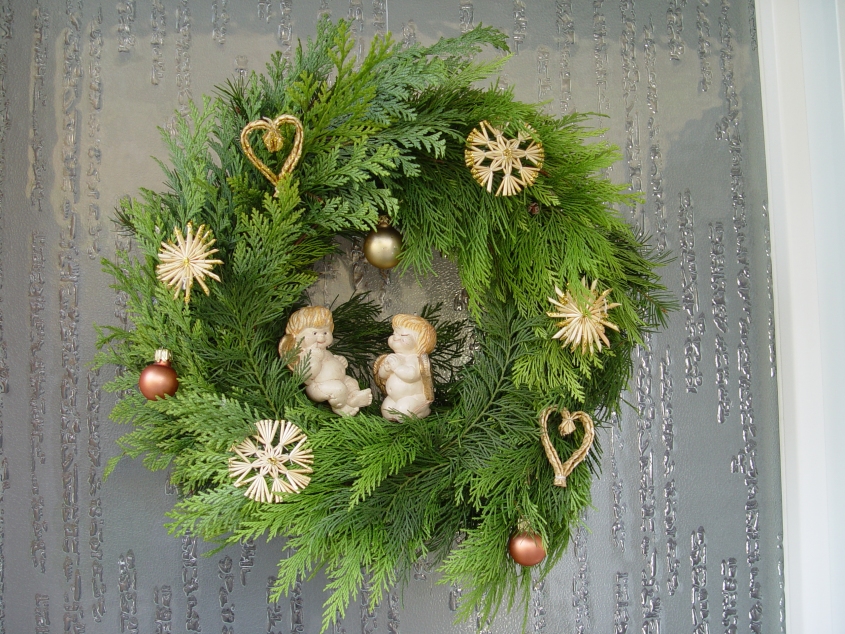 Ich habe am Freitag jetzt doch noch jemanden gefunden, bei dem ich ein bisschen im Garten schnippeln durfte. Hat nicht nur für den Türkranz gereicht, auch meine "Landschaft" wurde rechtzeitig zum 1. Advent noch ein bisschen grün.