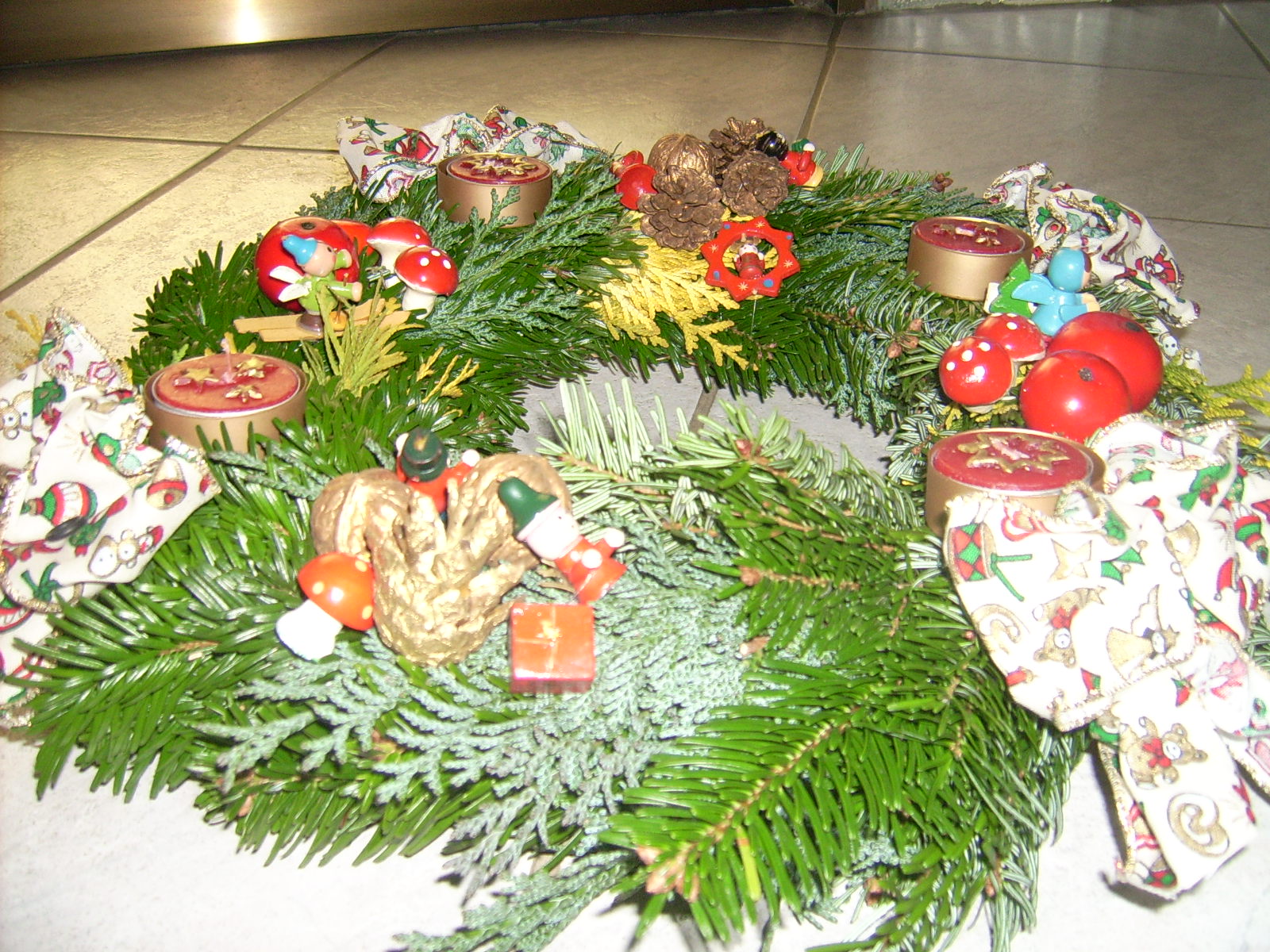Früher hatten wir einen künstlichen Kranz, weil uns ein gekaufter einfach zu teuer war und ich auch noch nicht wusste, wie man einen selbst macht (Das ist aber in der Zwischenzeit auch kein Problem mehr).