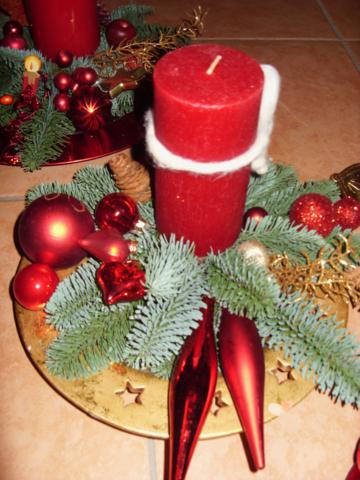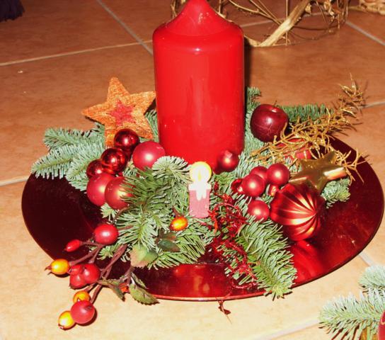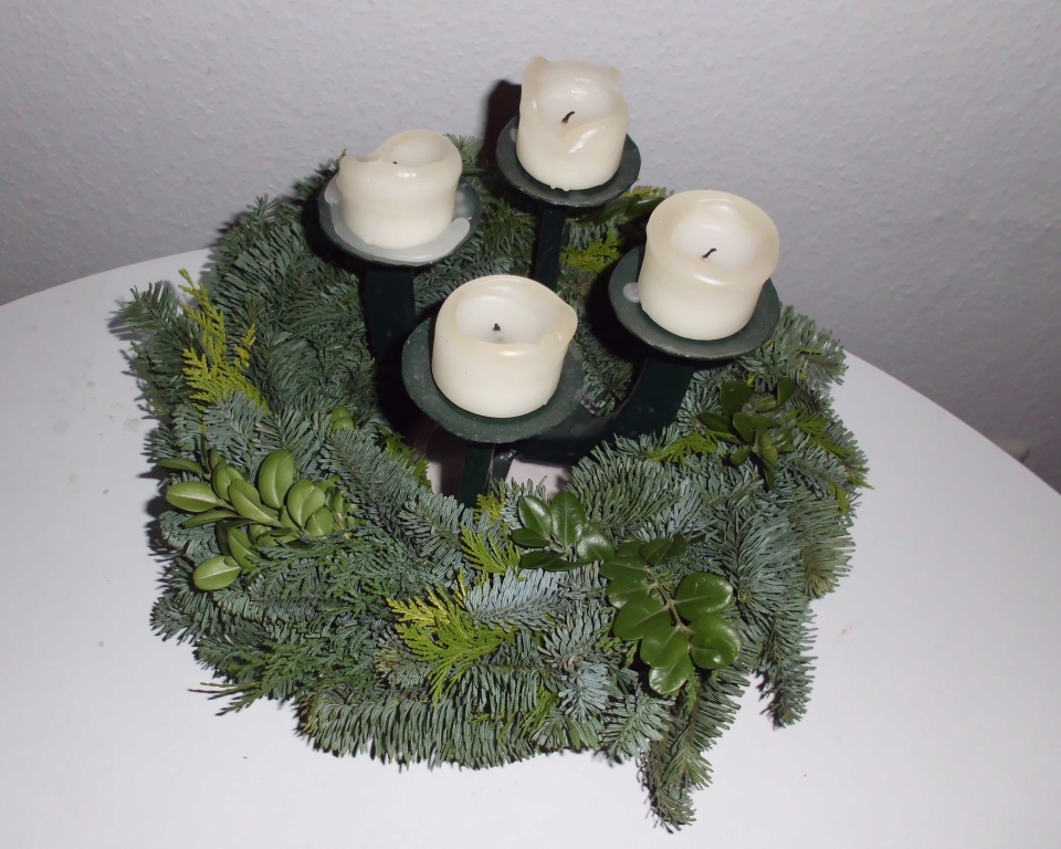 2. in den Adventskranz gestellt (darunter eine gläserne Tortenplatte aus Omas Nachlass, falls es doch mal tropft), und dann kommt