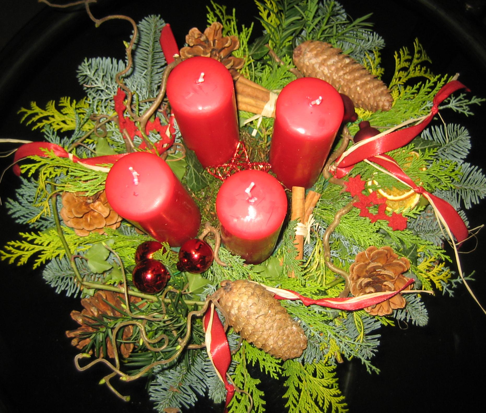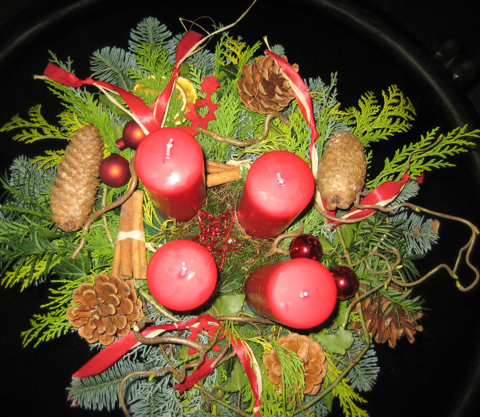 Nachdem ich mir am Montag, dem Tag NACH dem 1. Advent, wie schon letztes Jahr (da hab ich das zufällig rausgefunden ) einen um 50% preisreduzierten Adventskranz gekauft habe, habe ich vorhin die Deko vollendet.