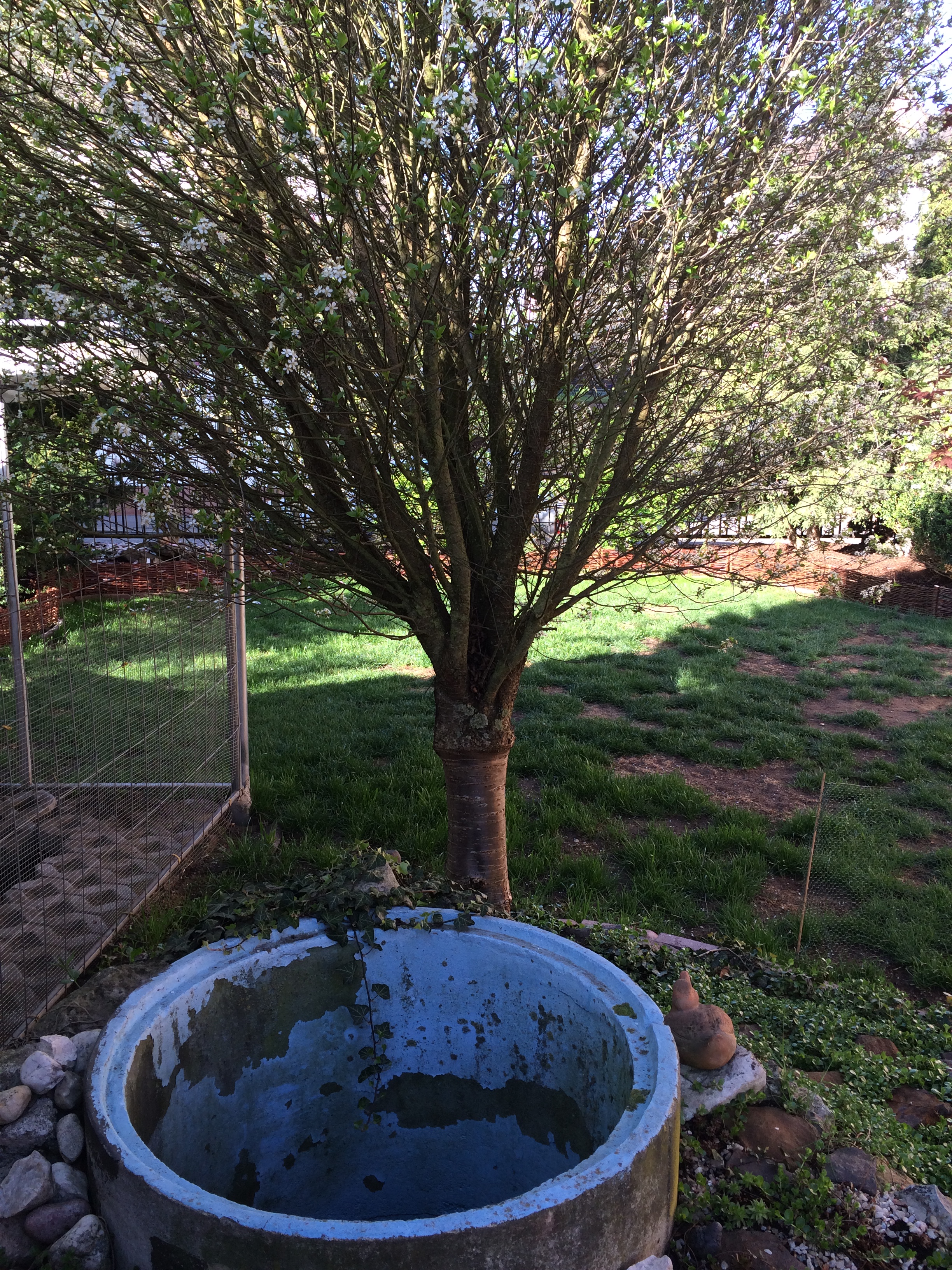 Etwa zwei Meter daneben steht ein veredelter anderer Baum, leider weiß ich nich genau was für einer, der Stamm ist aber von einem Kirschbaum. Kann es sein das der dem Ahorn zuviel Nährstoffe entzieht? Auch davon Bilder unten.