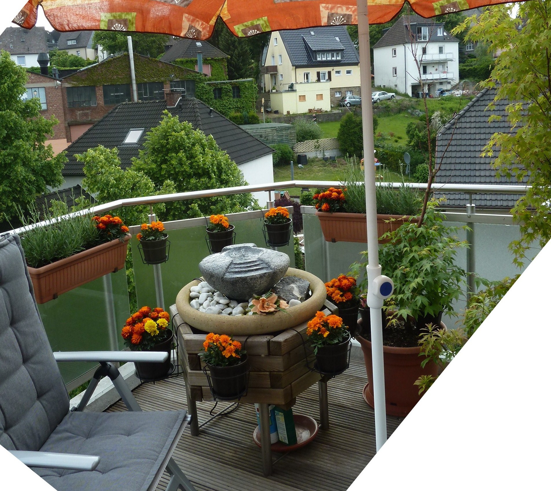 Der Lavendel ist weit oberhalb am Geländer ein gehangen. In der Anlage ist noch mal ein Bild. Darauf siehst Du das er stufenförmig vom Ahorn wegwächst. Die Düngerei ist ein Kapitel für sich, besonders für Lavendel. Die Erde habe ich gedrittelt. Dies sind neue Stecklinge aus Grasse (von Plantagen einer Parfümerieproduktion). Sie halten ca. 3 - 4 Jahre und werden in diesen Kästen fast 70 cm hoch und über dreifache Breite der Kästen. Die Schmetterlinge, Bienen und Konsorten die sie mit Ihrem extrem Duft anlocken, unvorstellbar. Die Tangetes kommt wieder raus. Sind auch Parfümpflanzen.