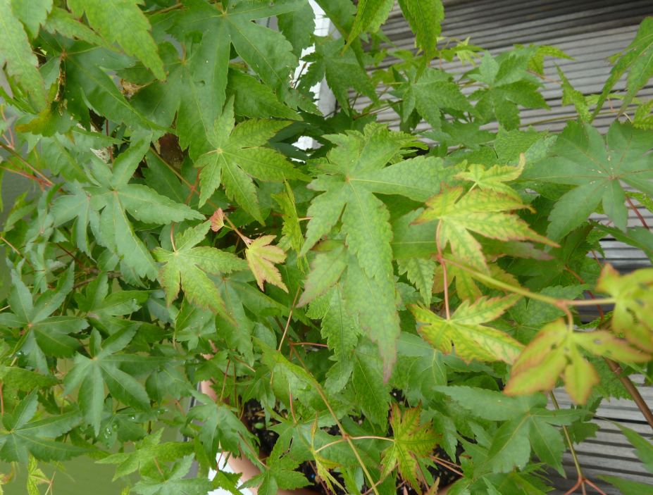 Nach ca. 4 Wochen, es war Anfang Mai, bildeten sich am unteren Teil unzählige Nebentriebe, mit vollem kräftigen Blattgrün. Bedingt durch den Ratschlag des Verkäufers, niemals einen Japanahorn zu schneiden, erfreuten wir uns an der Realität.