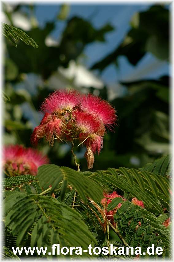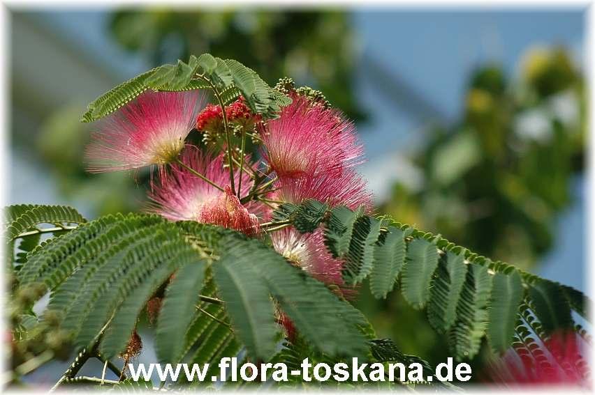 Pflanze: Laubabwerfender, im Kübel selten mehr als 400 cm hoher Baum mit dekorativen, zart duftenden, rosafarbenen Blüten im Sommer. Die zarten Fiederblätter falten sich abends zusammen ? daher auch der Name Schlafbaum.