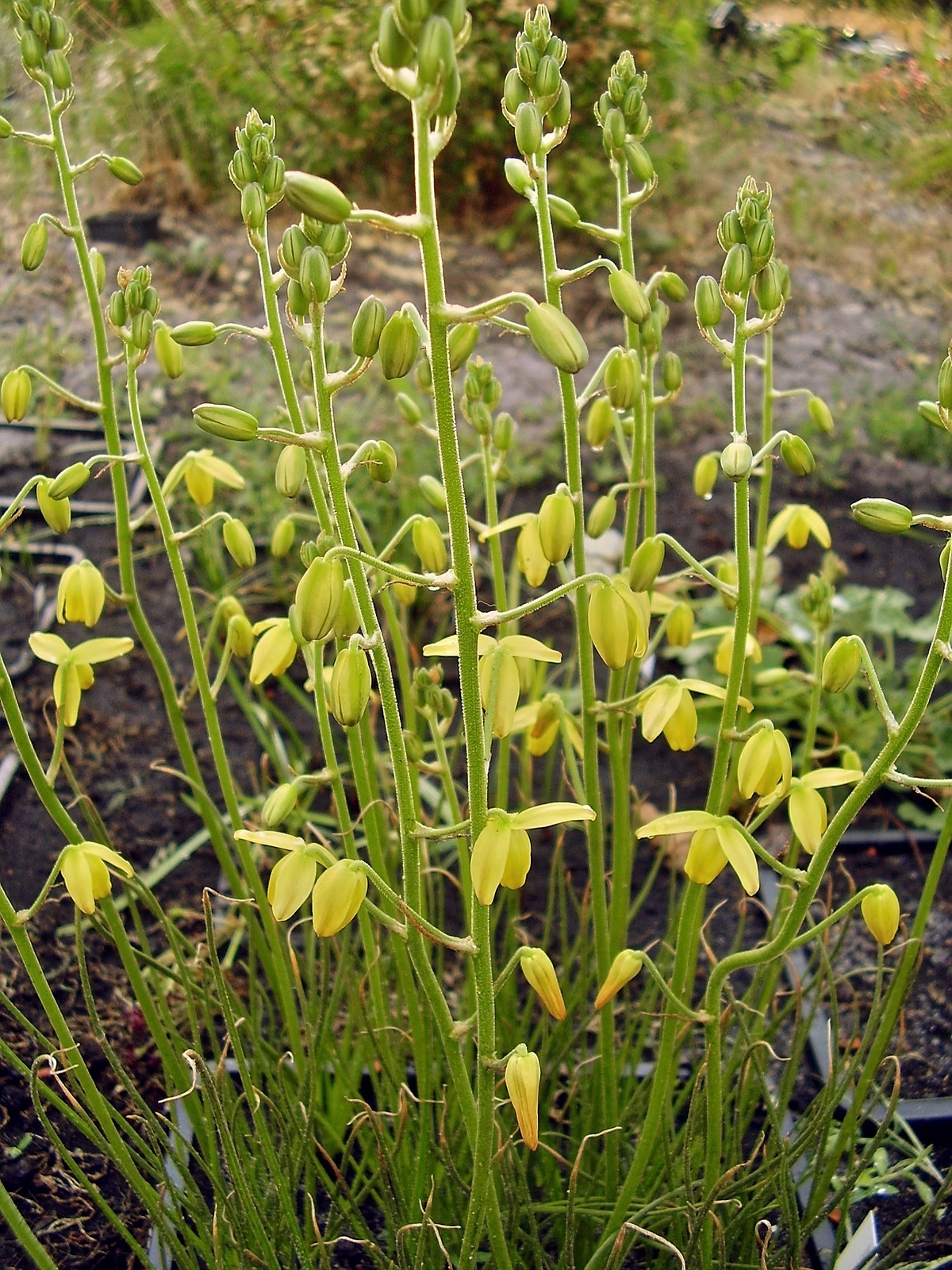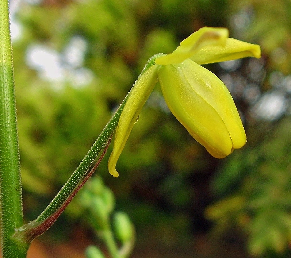 Blüte: Schaft bis 20 cm lang; in einer lockeren, vielblütigen, sich verlängernden Traube; Blütenstiel lang, drüsig behaart; Blüte hängend, glockig, ca. 25 mm breit; Sepalen fast horizontal, gelb mit grünlichem Streifen, Petalen hängend, parallel, an der Spitze verdickt, gelb; Blütezeit in Kultur Ende Juni bis Oktober.