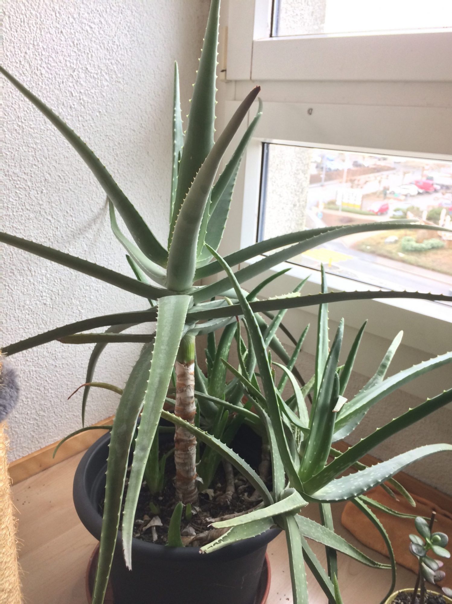 Aloe vera. Die grosse, ca. 15-jährige sass zusammen mit älteren und ganz jungen Ablegern in dem einen, im anderen Topf befinden sich vor Jahren abgetrennte Ableger, die ihrerseits wieder für Ableger gesorgt haben. Jahrelang stark vernachlässigt, habe ich letzten Sommer beschlossen, die Pflanzen wieder zu pflegen und vor allem die Mutterpflanze wieder hübsch zu bekommen. Diese minimal pflegebedürftigen, einfachen Pflanzen haben es doch verdient …