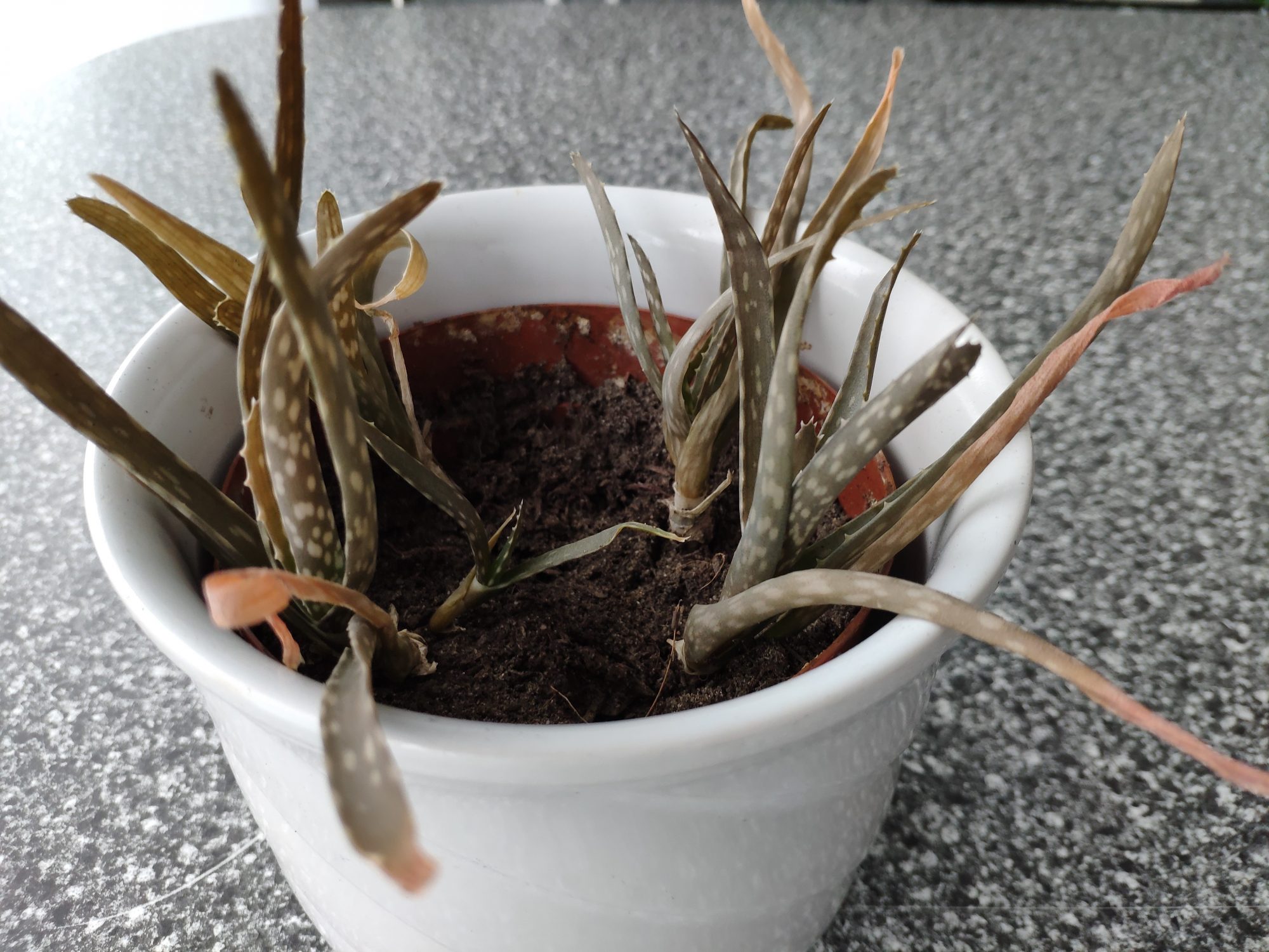Meine Aloe Vera sieht leider immer schlechter aus. Als Massnahme habe ich sie von Blumenerde zu Kakteenerde umgetopft, leider sieht sie nun noch schlimmer aus.