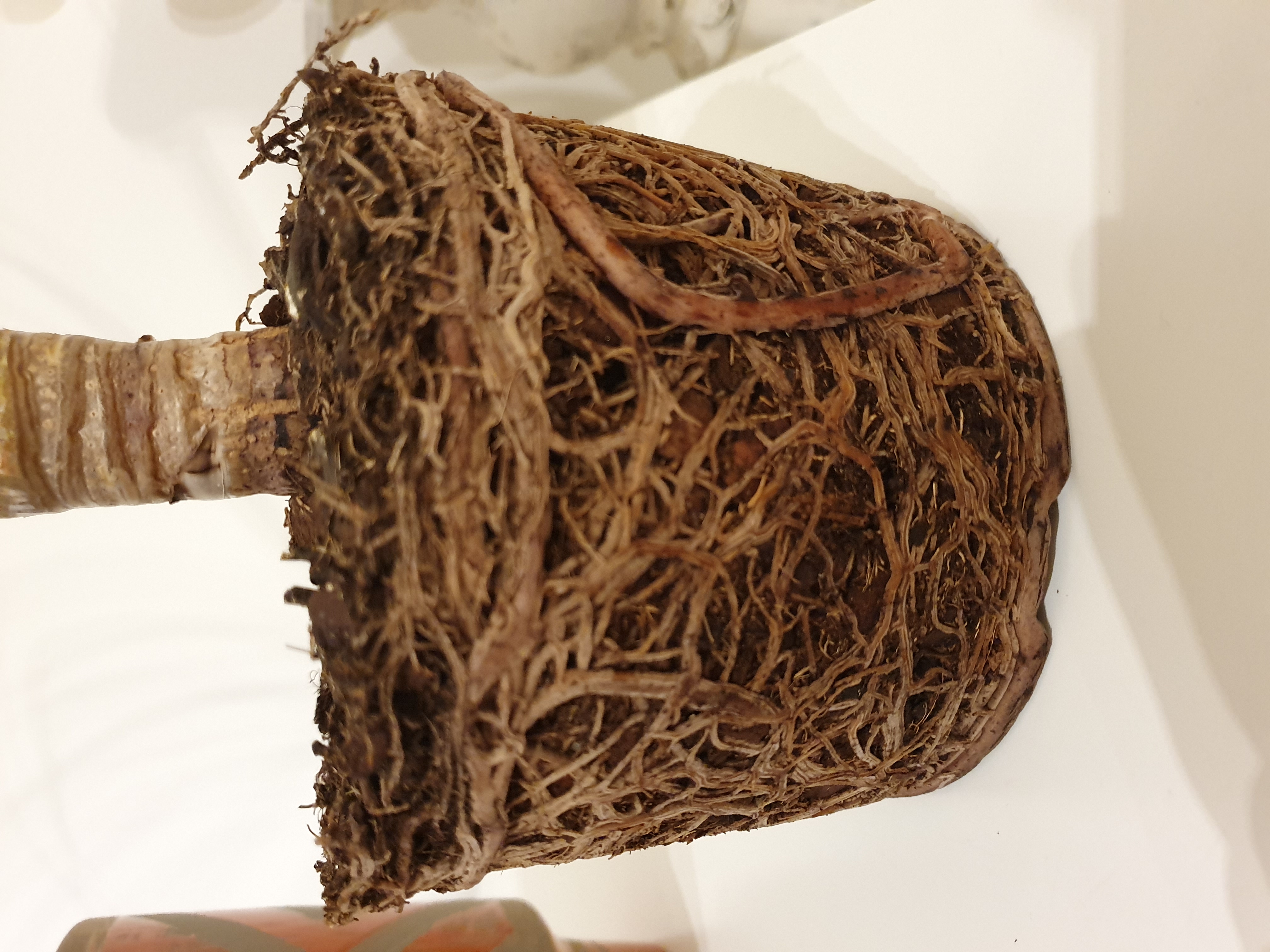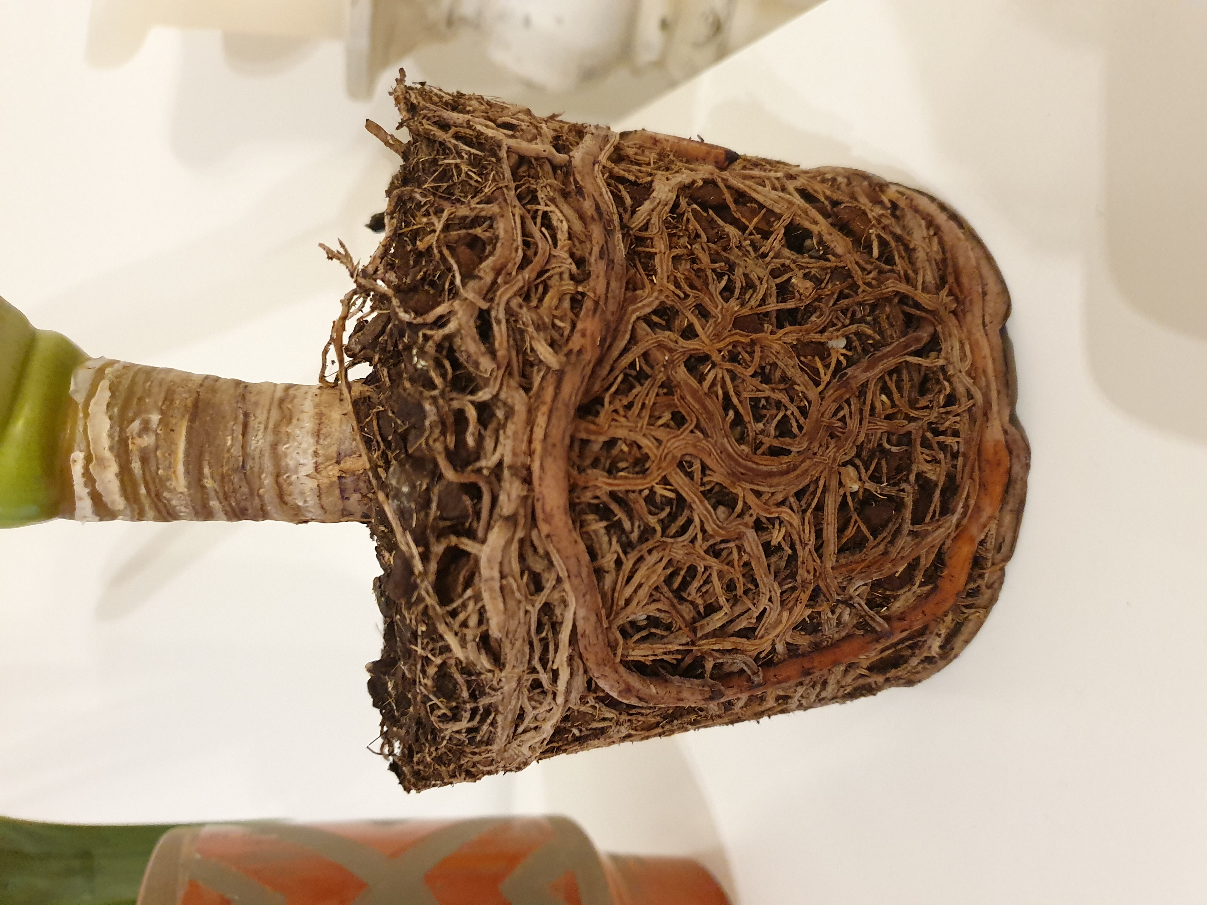 Ich bin mir allerdings aufgrund der Fotos nicht sicher, ob bzw. inwieweit die Wurzeln noch intakt und funktionsfähig sind. Immerhin ist nichts faulig (dunkelbraun bis schwarz). Sie sehen aber irgendwie vertrocknet aus. Sie sollten eigentlich rund und «saftig» sein. Vielleicht täuscht aber das Foto und es liegt nur daran, dass sich die äussersten Wurzeln so stark an den Topf geschmiegt hatten. Oder steht sie nun schon länger trocken? (Sorry, ich hab’s nicht kapiert, ob die Erde im Moment gerade noch immer feucht ist, oder ob du sie jetzt schon länger nicht gegossen hast.)