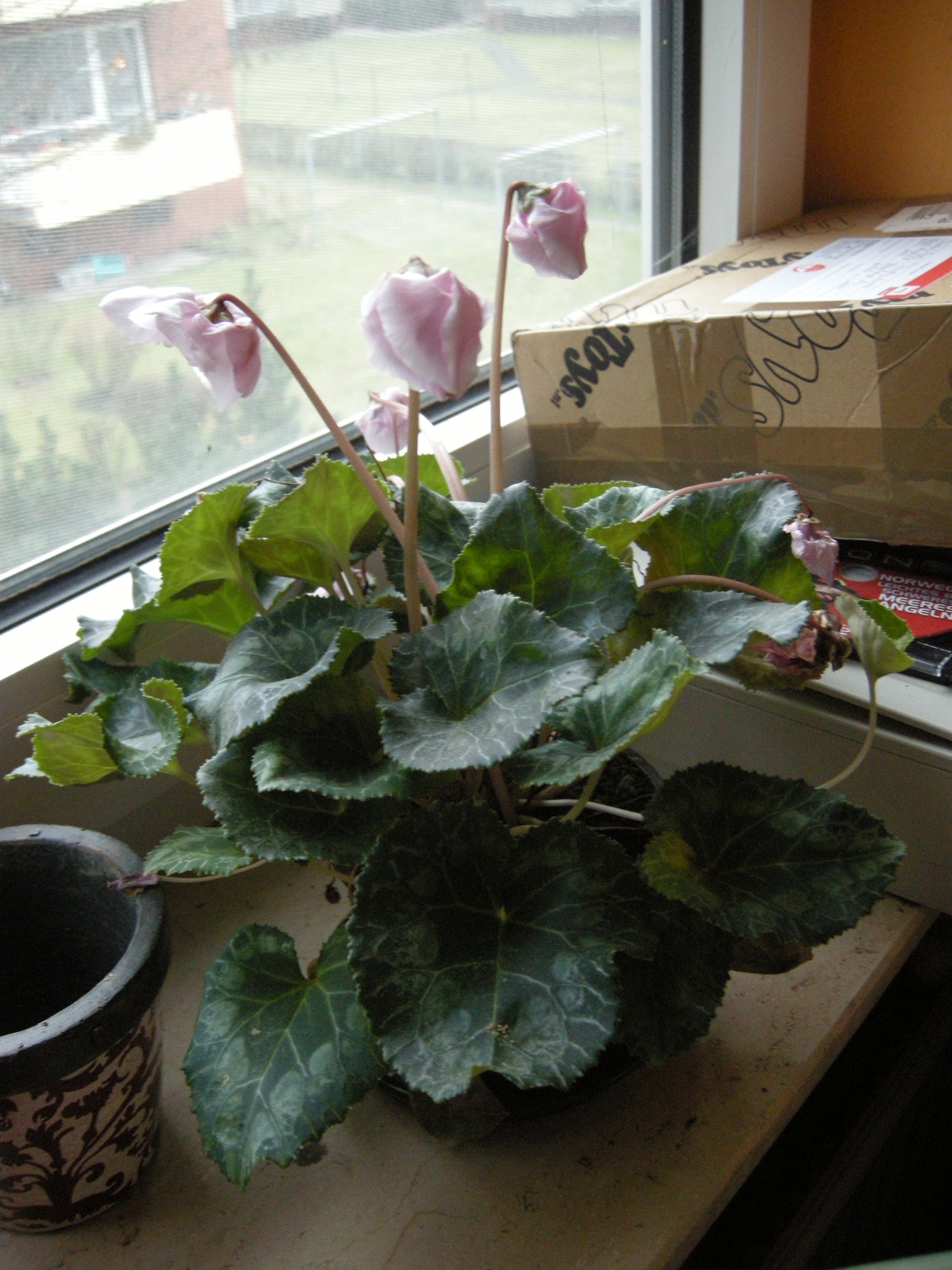 Ich habe im Sommer runtergesetzt zwei herbstblühende Alpenveilchen gekauft, die etwas durcheinander waren und seitdem immer mal wieder geblüht haben. Eines davon sitzt schon seit einiger Zeit hier in einer Schattenböschung, für das andere muß ich noch dringend einen Platz finden.