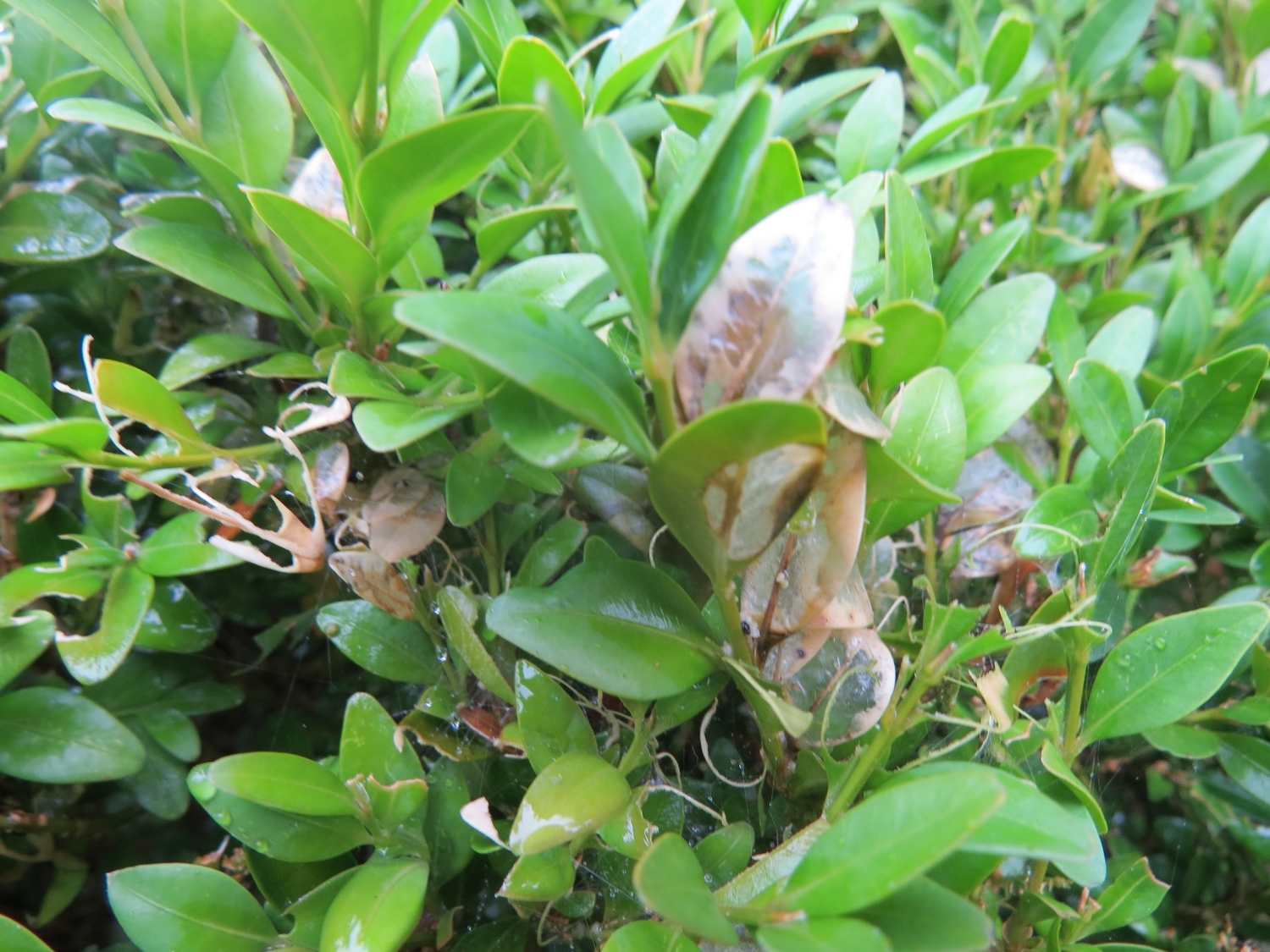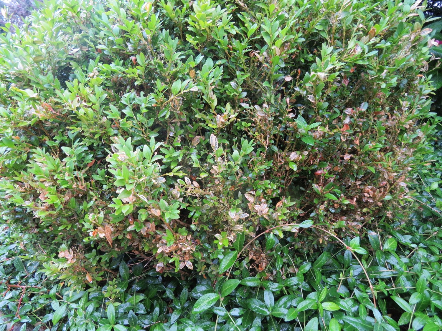 Leider musste ich nun auf unserem größeren, alten Buchsbaumstrauch (statt im Halbschatten) feststellen, dass sich dort an vielen Seiten scheinbar im Verlauf der letzten Tage ein Pilz (?) ausbreitet. Hier war es in den letzten Wochen nach einem trockenen / heißen Juni, im Juli sehr feucht, wir selber haben den Buchsbaum nur von unten (im Bereich des Stamms) begossen.