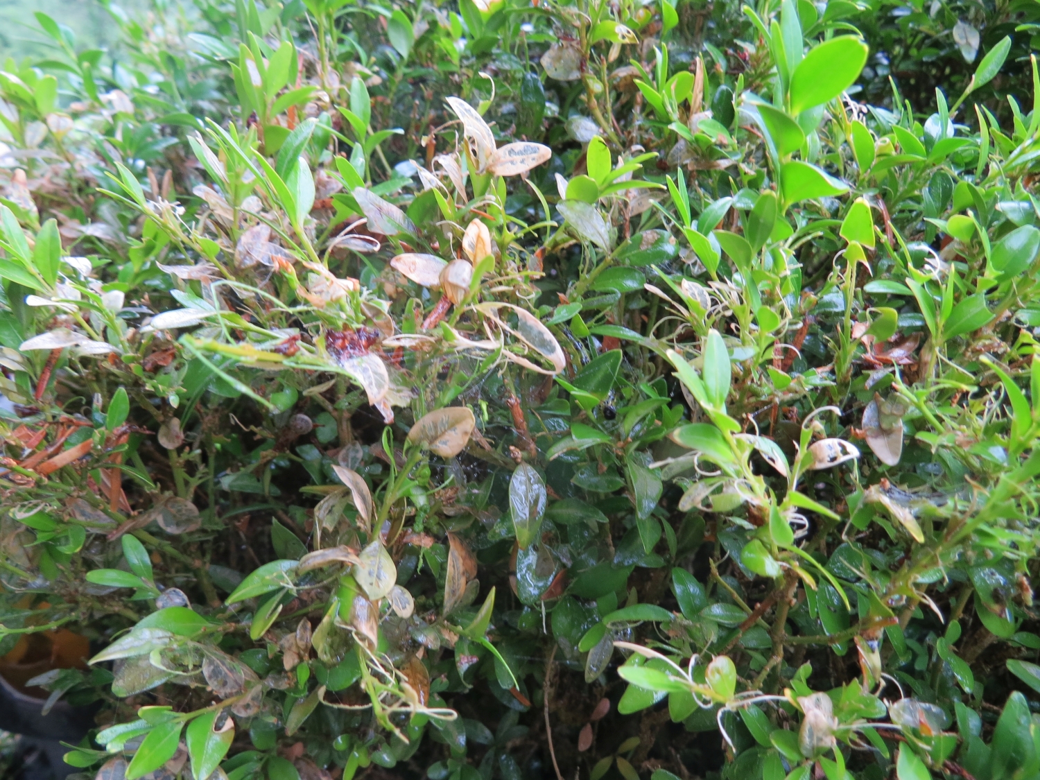 Leider musste ich nun auf unserem größeren, alten Buchsbaumstrauch (statt im Halbschatten) feststellen, dass sich dort an vielen Seiten scheinbar im Verlauf der letzten Tage ein Pilz (?) ausbreitet. Hier war es in den letzten Wochen nach einem trockenen / heißen Juni, im Juli sehr feucht, wir selber haben den Buchsbaum nur von unten (im Bereich des Stamms) begossen.