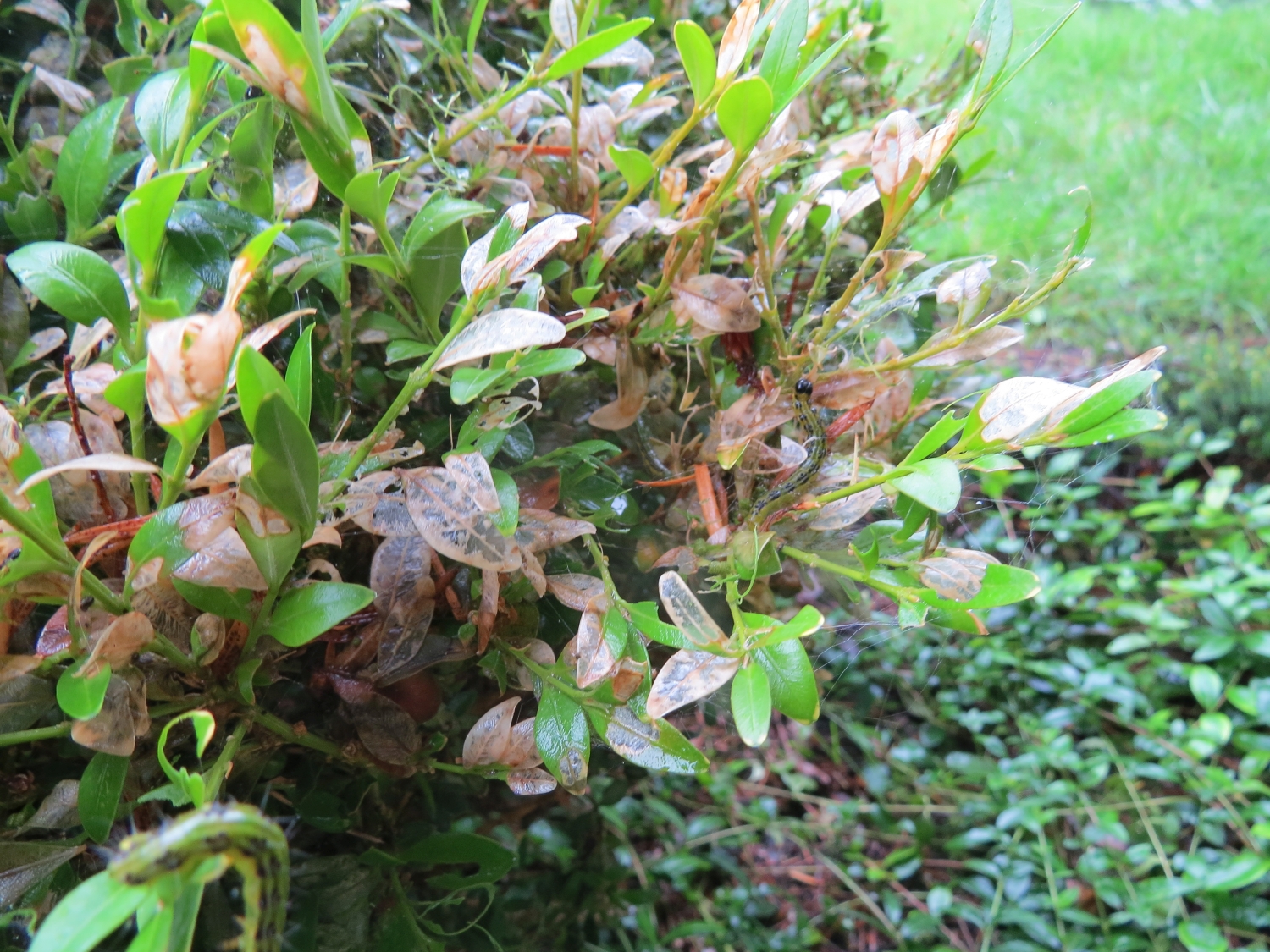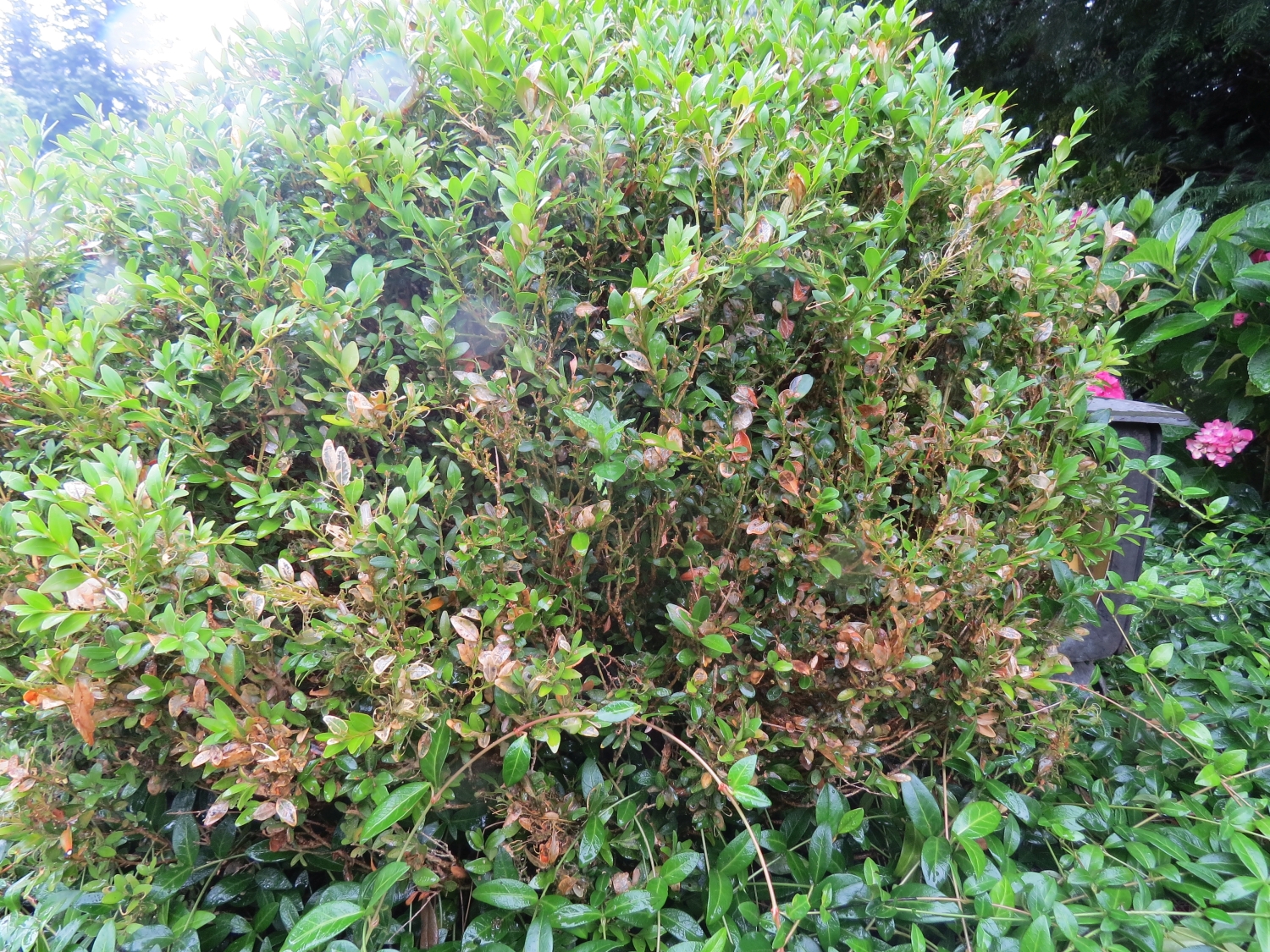 Leider musste ich nun auf unserem größeren, alten Buchsbaumstrauch (statt im Halbschatten) feststellen, dass sich dort an vielen Seiten scheinbar im Verlauf der letzten Tage ein Pilz (?) ausbreitet. Hier war es in den letzten Wochen nach einem trockenen / heißen Juni, im Juli sehr feucht, wir selber haben den Buchsbaum nur von unten (im Bereich des Stamms) begossen.