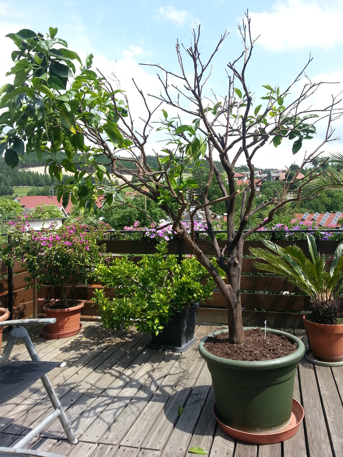 Mein Großvater in seinem guten Willen, versucht dies auszugleichen indem er ihn sehr viel gießt und düngt. Also 1-2x ordentlich mit der Gießkanne und jeden 3. Tag mal ein Bisschen Flüssigdünger ins Wasser. Nachdem er soviele Blätter verloren hatte konnten wir ihn diesen Sommer nun wieder auf die Terrasse stellen, ob das was bringt weiß ich aber nicht