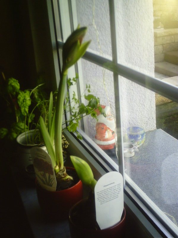 Amaryllis im Wasserglas geht, aber wir haben es mit Aquakorn gemacht (von Keyzers) und sie dann reingesetzt.