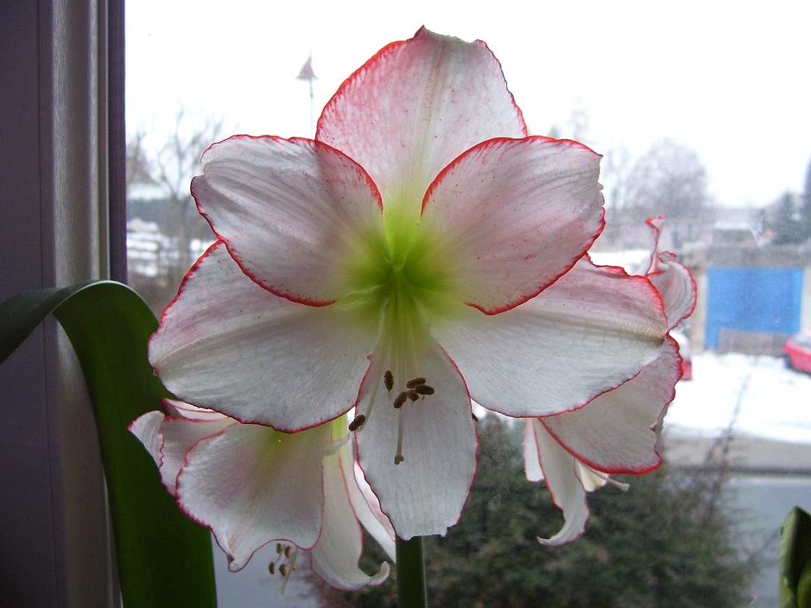 Und wie Du auf den beiden Photos oben sehen kannst, war das rot beim ersten Blütenstand, als die Pflanze vermutlich wochenlang in Lagern, Lastwagen und im Baumarkt rumstand, viel weniger intensiv als jetzt beim zweiten Blütenstand, da sie nun schon enige Zeit am Südfenster steht.
