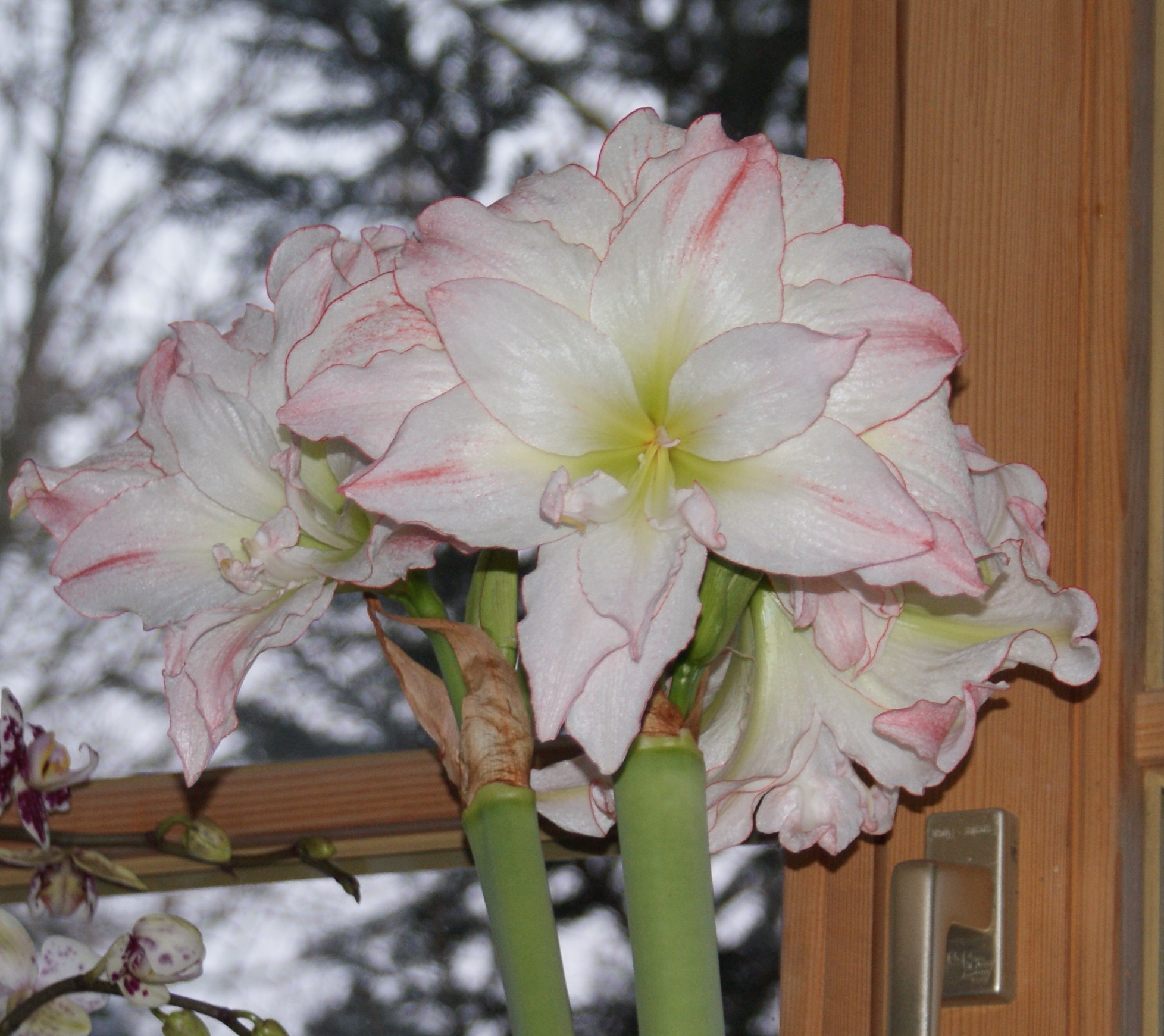 Meine kommen dann an einen möglichst hellen und nicht ganz kalten Platz. Die treiben ja nun die Blätter, um wieder Nährstoffe in die geschlauchte Zwiebel einzulagern. Da muß man schon Licht und Temperatur anbieten. Es ist nicht ganz so einfach , weil sie ja nun doch an Schönheit verloren haben. Wenn sie dann aber raus können, ans Licht gewöhnen und gut düngen.