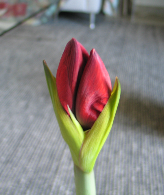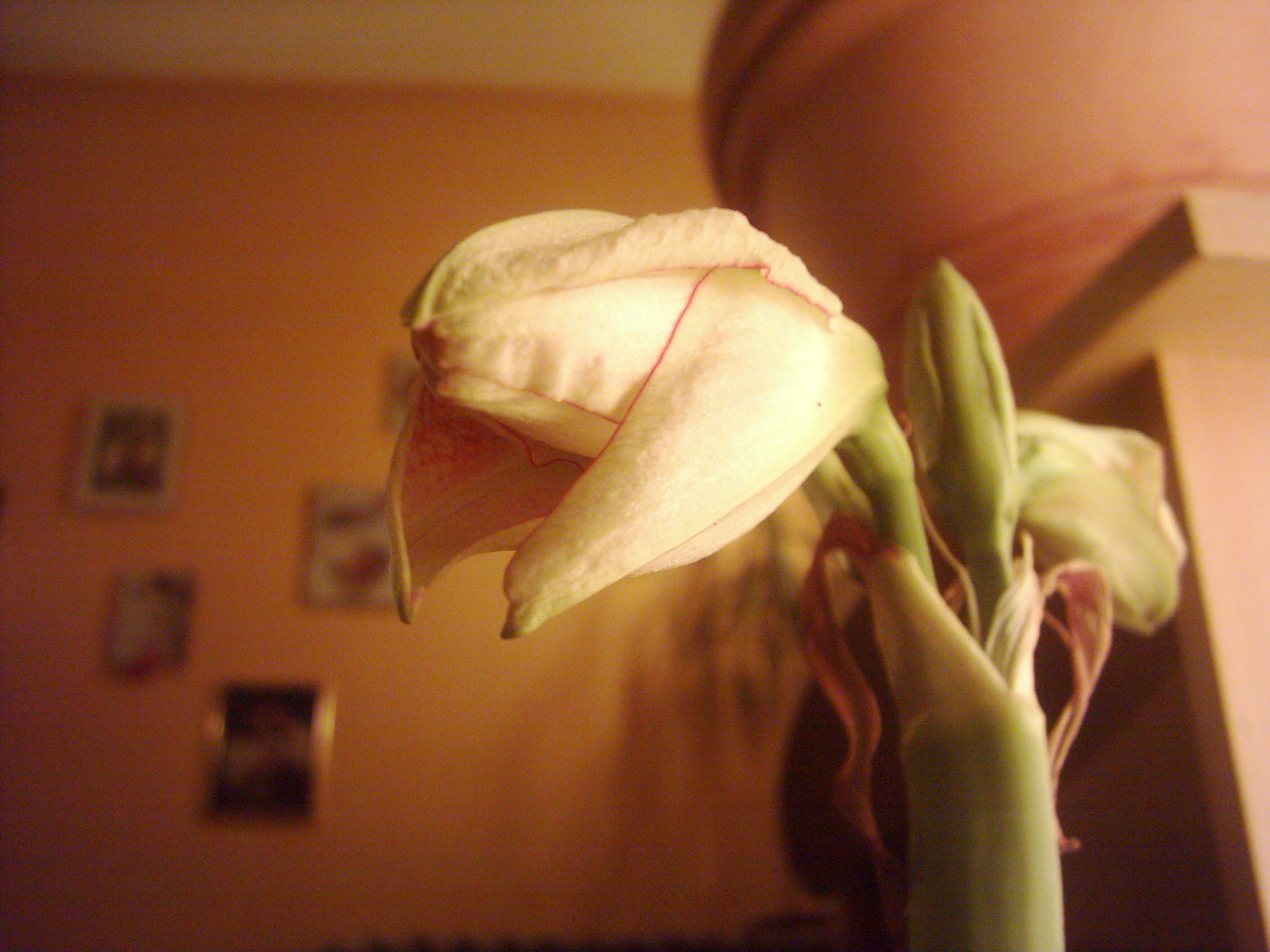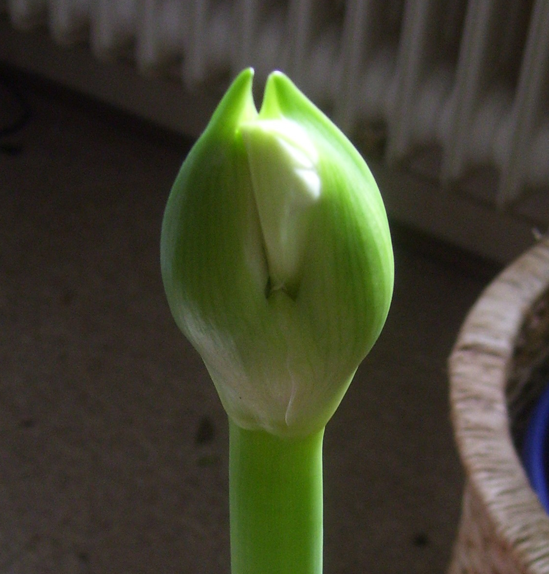 Juhuuuuu, meine rosa-weiße Amaryllis scheint so auszusehen, wie auf dem Bild. Und sie fängt an, aufzublühen