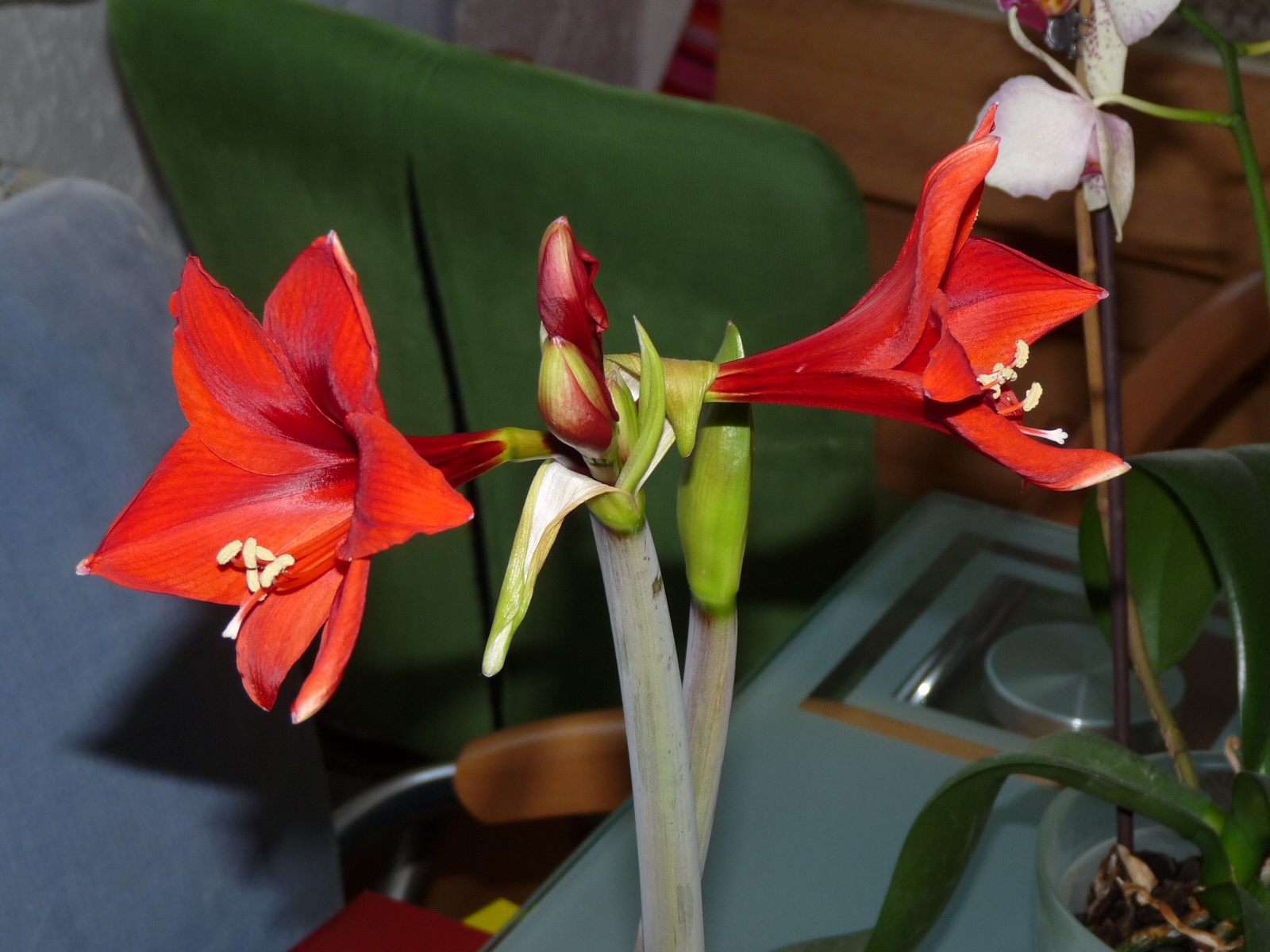 Meine Red Pearl ist soweit.. die Blüten sind sooo riesig, das haut einen echt um. Hab zum Vergleich mal die Black Velvet daneben gestellt, sie wirkt winzig