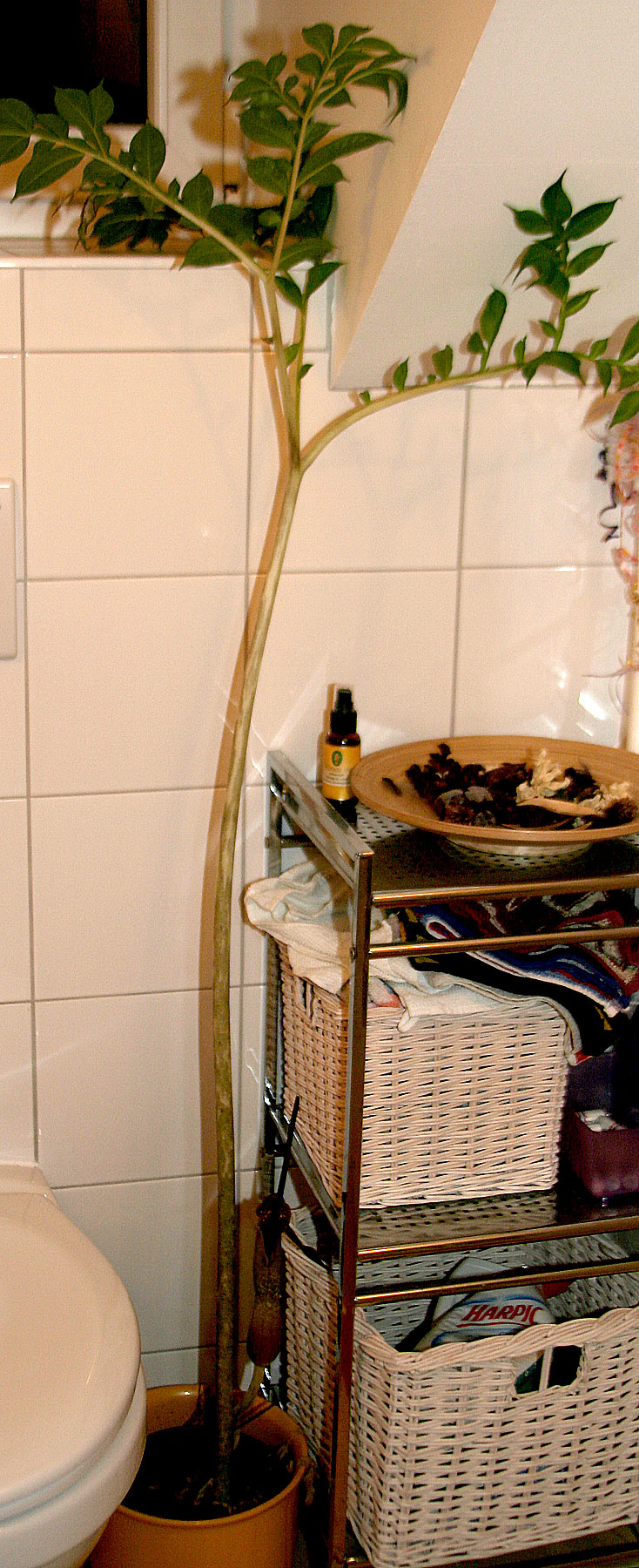 Der Topf schafft es nicht in die Abstellkammer zu den anderen Tränenbäumen, denn einer, oder die anderen wachsen gerade. Also keine Ruhepause. Dieser Topf steht also das ganze Jahr warm, im Sommer draußen, und im späteren Herbst, viel früher als die anderen, kommt der in die Wohnung, weil der Anfang bis Mitte Oktober gerade austreibt. Das ging jetzt über den ganzen Winter. Jetzt kommt die Blüte, und der ander ist noch vom Vorjahr grün. Bis der die das Blatt abwirft ist die andere Knolle mit dem Normalrythmus am austreiben.