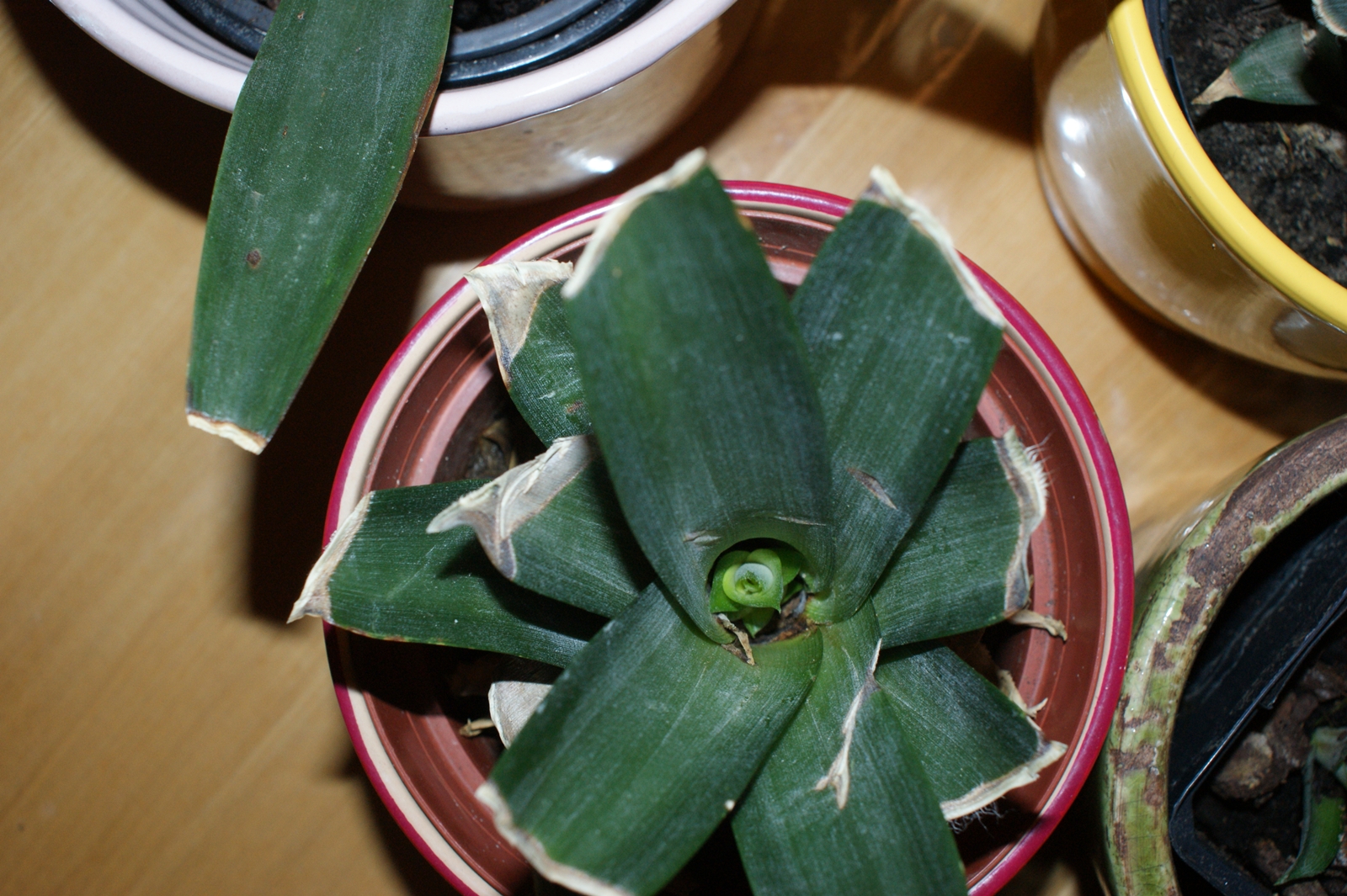 Bei einer meiner normalen Ananaspflanzen, die ich im Frühjahr bewurzelt habe, wächst nun ein winziger Ableger im Topf Ich habe vor ein paar Tagen beinahe Luftsprünge gemacht, als ich beim Gießen die klitzekleine Mini-Ananaspflanze neben der größeren entdeckte. Und dabei wollte ich genau jene Ananaspflanze jemandem schenken, aber als ich den kleinen Ableger sah, hatte sich das erledigt.