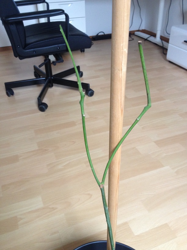 Ja das ist mir jetzt auch klar :/ Ich hätte ihr zumindest zwei oder drei Blätter lassen sollen. Ich mache gerade mal ein oder zwei Fotos vom Stamm. Die "Vertrocknung" oder "Verastung" geht weiter voran.