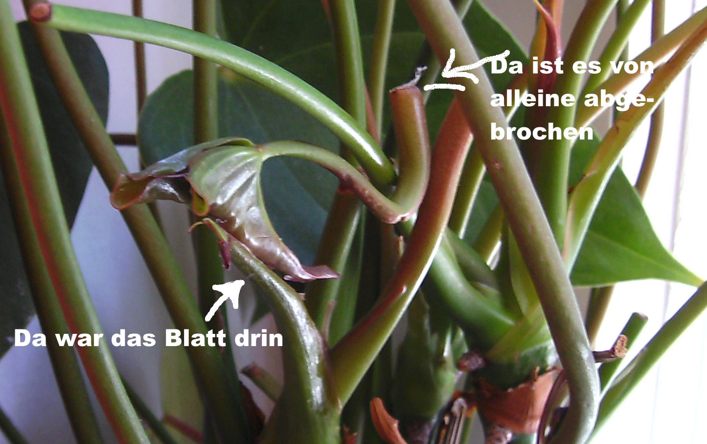 Nein, sorry, hab kein Bild. Dann muss ich auf das nächste Blatt warten. Die kommen doch kopfüber aus ihrer kleinen Geburtshülle, also erst der Stängel, der muss dann genug Kraft haben, das Blatt rauszuheben, und das schafft er nicht, er bricht.