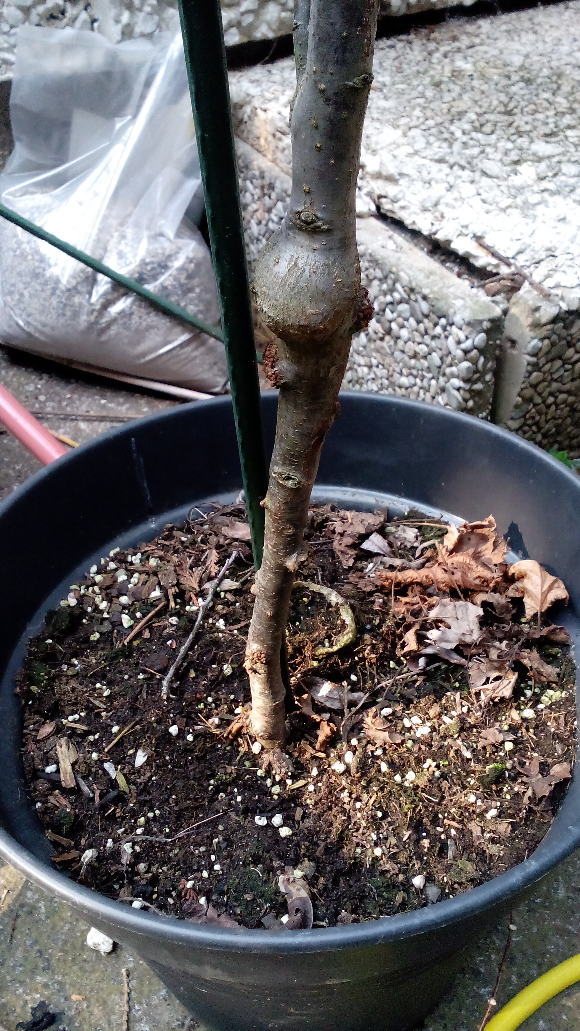 nun nachdem ich ja einen eigenen Garten habe, haben die es mir wieder mit den Topf zurück gegeben. Und was sehe ich da, unter der Veredelungsstelle hat sich da etwas getan und ist das eventuell ein wurzelansatz?