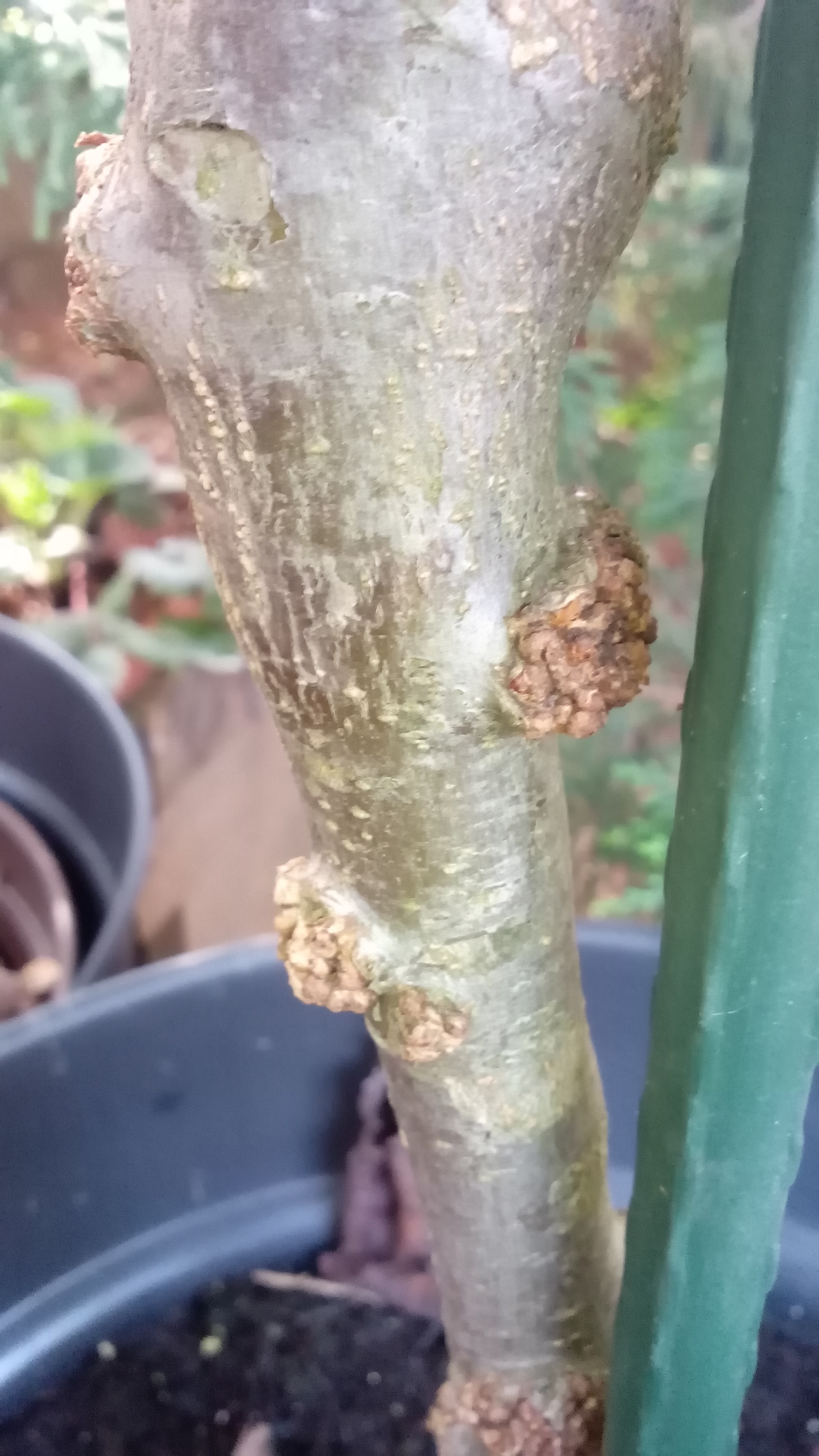 nun nachdem ich ja einen eigenen Garten habe, haben die es mir wieder mit den Topf zurück gegeben. Und was sehe ich da, unter der Veredelungsstelle hat sich da etwas getan und ist das eventuell ein wurzelansatz?
