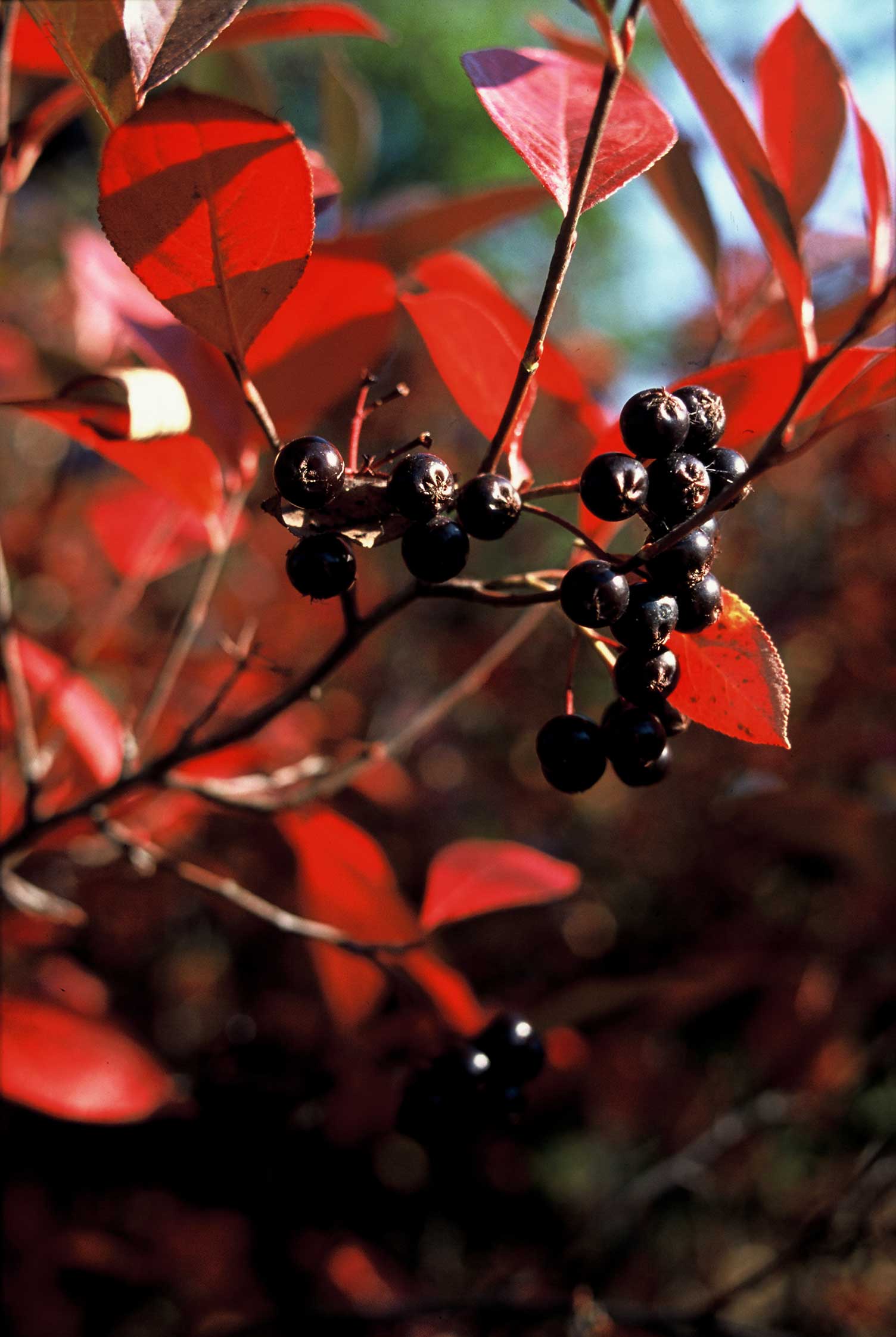 Die Apfelbeere (Aronia melanocarpa), eine interessante Köstlichkeit im herbstlichen Garten, ist in unseren Breiten noch recht unbekannt. Sie stammt ursprünglich aus dem Osten Nordamerikas und gedeiht dort auf feuchten und sauren Standorten, kommt aber mit trockeneren Standorten auch zurecht. Die Apfelbeere gehört zur Familie der Rosengewächse (Rosaceae) und kann als Busch zwischen 2 bis 3 m hoch werden. Ab Mai erscheinen 1?1,5 cm große, cremeweiß bis blassrosa gefärbte Blüten: Bis zu 20 Einzelblüten sind zu beeindruckenden, doldenartigen Blütenständen zusammengefasst. Je nach Fruchtstand reifen etwa 15 erbsengroße, schwarze Früchte, die ab Mitte August bis Oktober geerntet werden können. Die rote Herbstfärbung des Laubes ist neben Blüten und Früchten ein weiterer Pluspunkt für die Apfelbeere. Ihre Früchte sind zum Rohverzehr nicht geeignet. Sie können jedoch zu leckeren Marmeladen und Gelees, Fruchtsoßen und Likören verarbeitet werden.