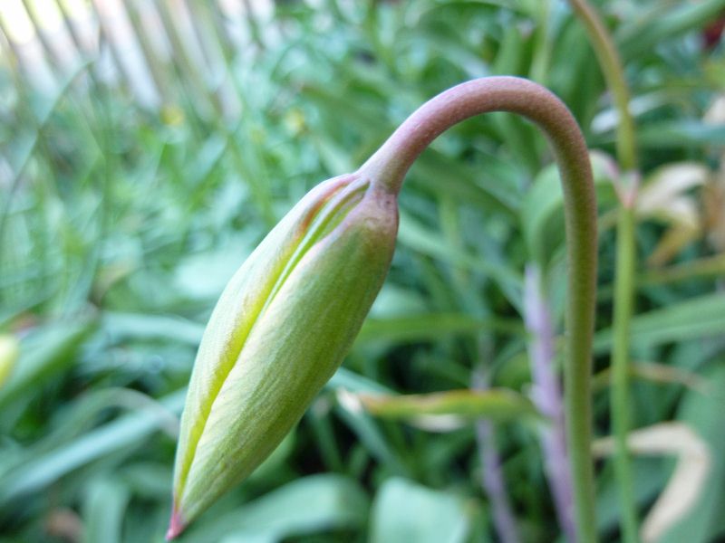 Die Weinbergstulpe ist meines Wissens nach die einzige Tulpe, deren Knospen wie Glocken nach unten hängen. Wenn sie dann aufblühen stehen sie (s. Fotos).