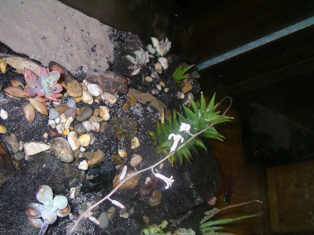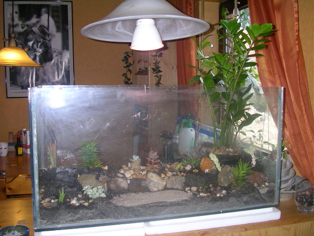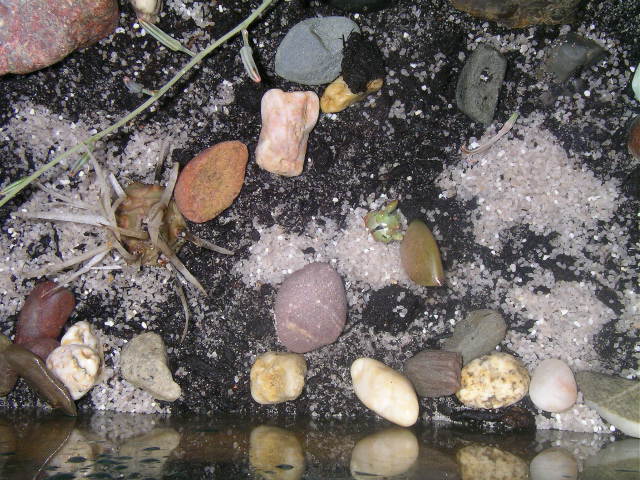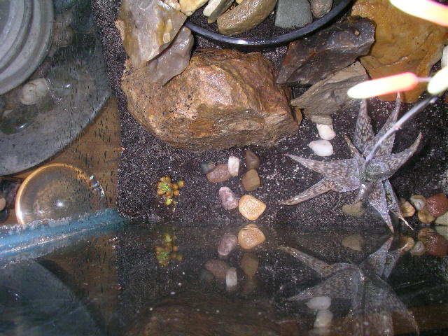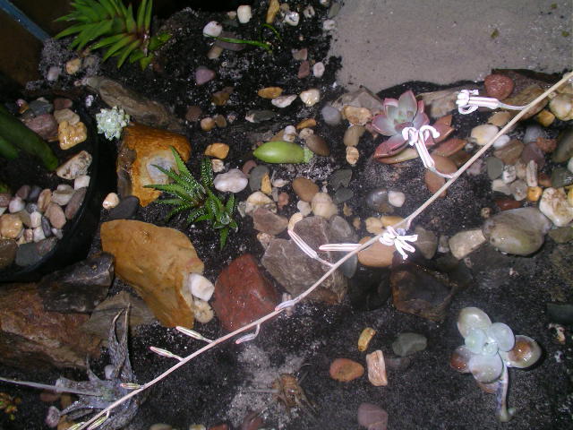 vorder- und rückseite wurden flach gestaltet und durch die mitte ein kleiner hügel, so kann man von beiden seiten gut reinschauen, als substrat eine mischung aus guter kübelerde und quarzsand, vorne etwas mehr sand/erdmischung für die lebenden steine, die zami ist im grossen topf gebleiben, steindeko hab ich im grossen steinhaufen gefunden