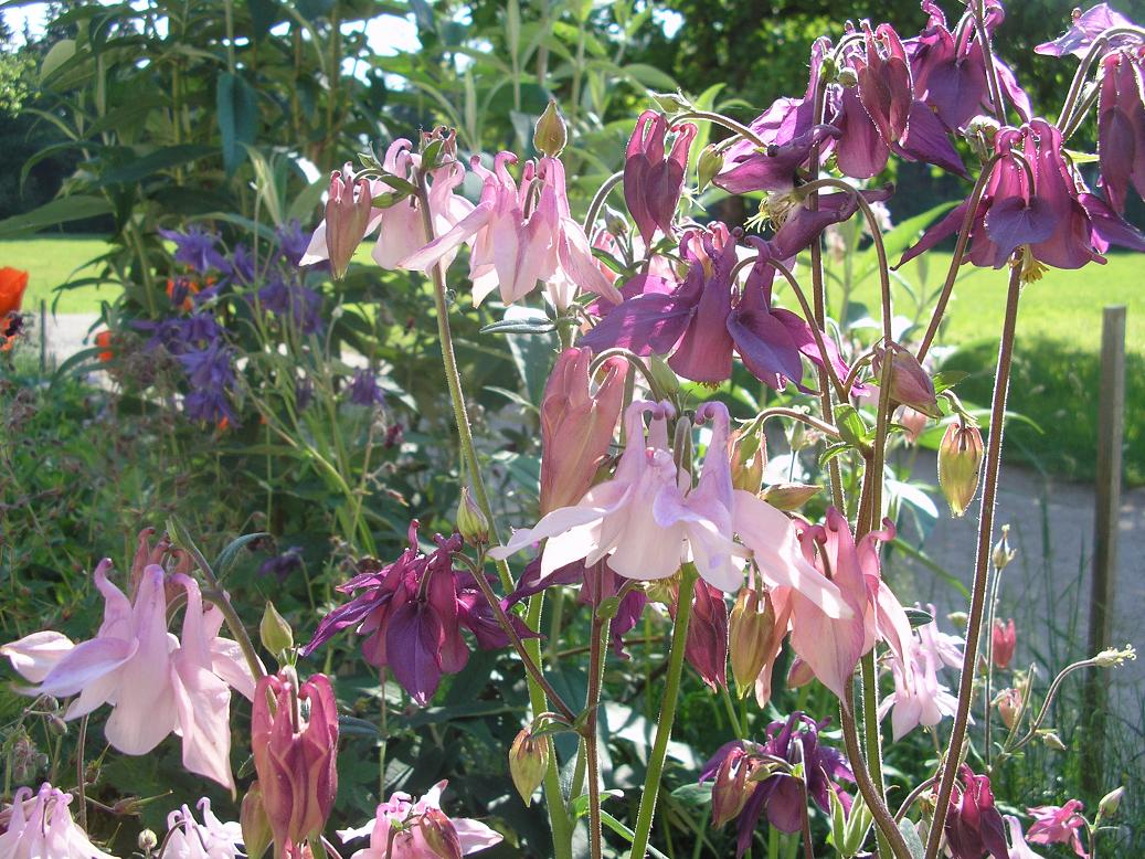 Blütenbeschreibung: nickende glockenartige Blüten, mit fünf nektarhältigen eingebogenen Spornen in blau, lila, weiß, rosa, pink, weinrot, gefüllt und zweifärbig