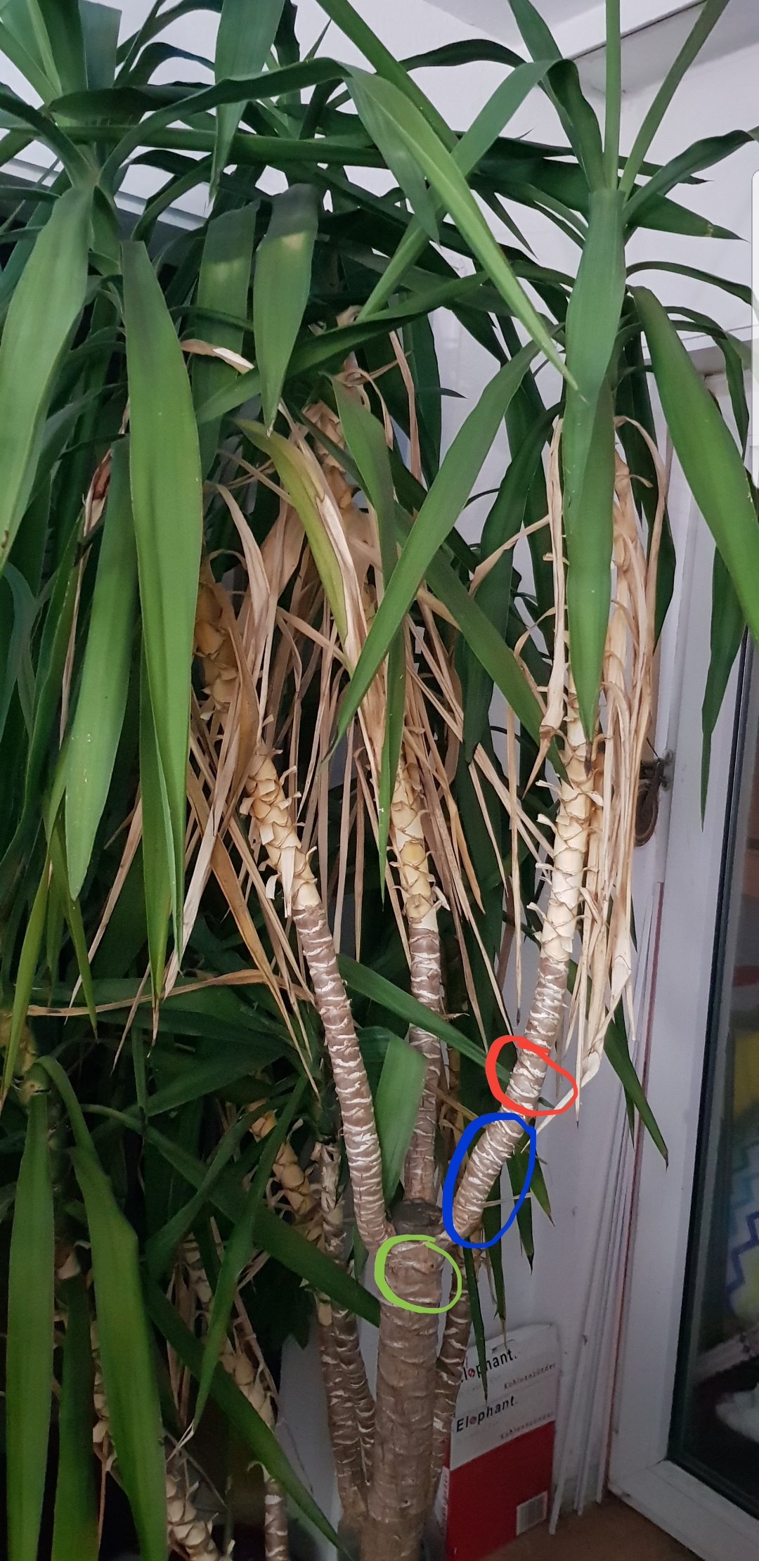Ich hatte jetzt gehofft, wenn ich sie an der roten Stelle schneide (siehe Foto), treibt sie irgendwo in blau wieder aus. Nur habe ich jetzt im Forum gelesen, dass Yuccas nur aus dem Stamm wieder austreiben.