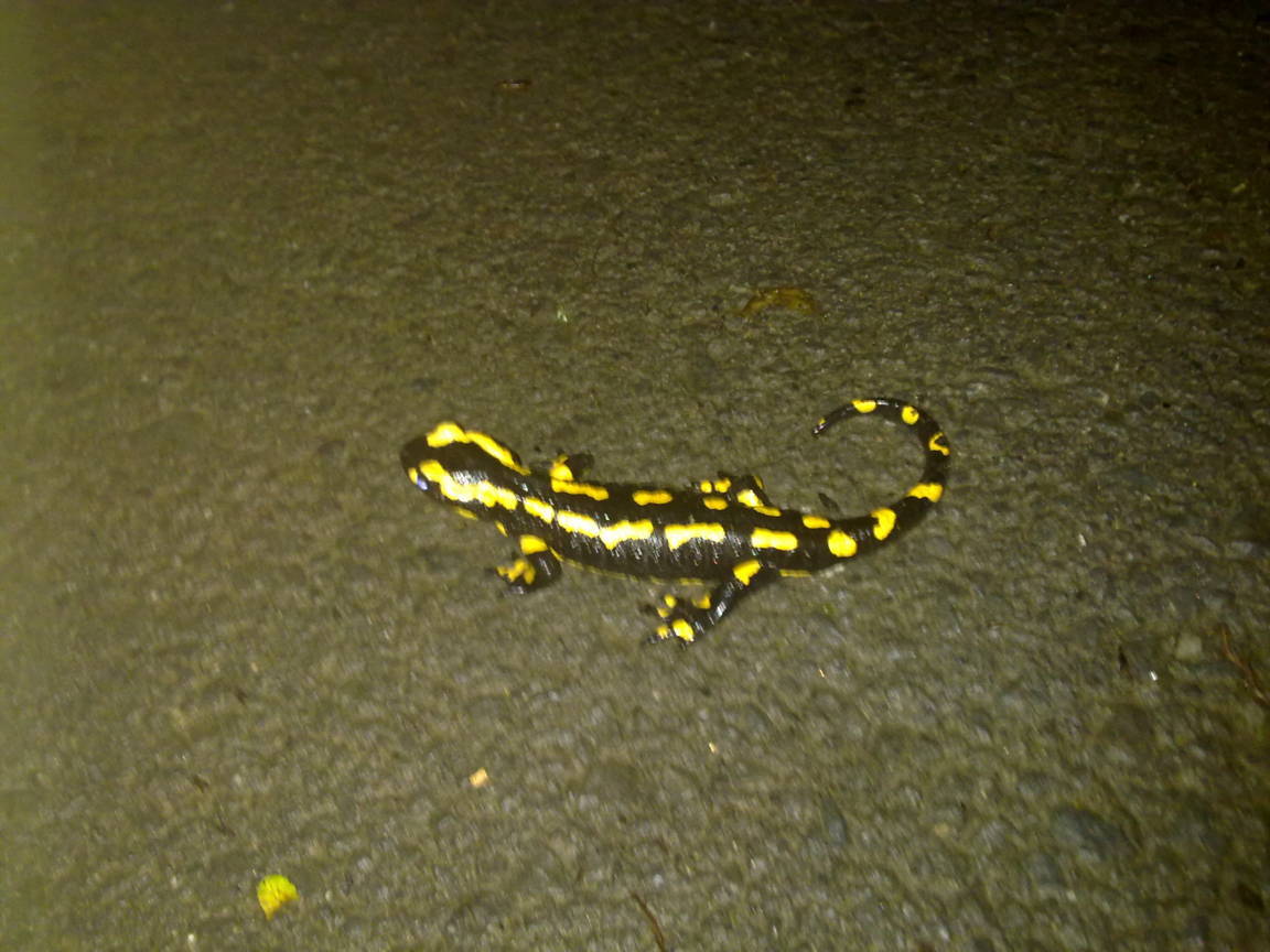 Vorletzte Nacht war ideales Salamanderwetter- leichter Regen, fast 100% LF und angenehme Temperaturen. Also beschloß ich, die letzte Gassirunde etwas auszudehnen und zwei mir bekannte Feuersalamanderstandorte gar nicht weit von meinem Haus aufzusuchen. Irgendwann nach Mitternacht ging ich mit den Hunden und mit Stirnlampe und Handy los.