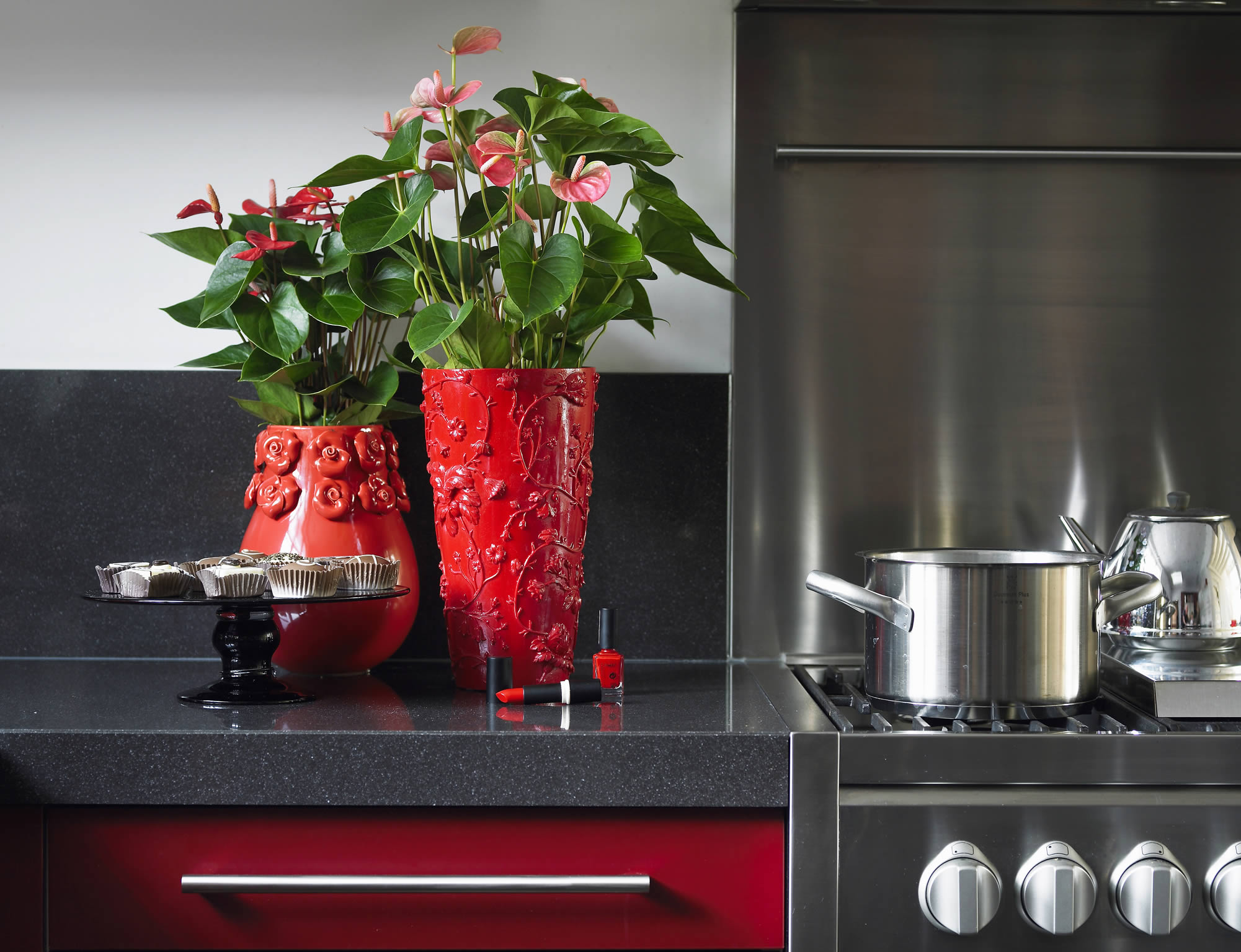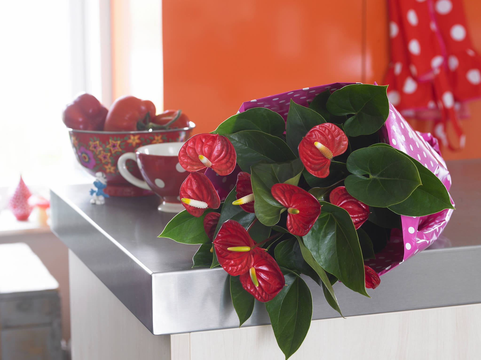 Sie glauben, dass sich in einer so funktional geprägten Atmosphäre Topfpflanzen nicht wohlfühlen würden? Weit gefehlt. Anthurien sind die perfekten grünen Mitbewohner, die mit ihren typischen Blütenkolben und den ausgefallenen Hochblättern für natürliche Akzente sorgen. Ganz im Sinne der kühlen Küchenästhetik wirken ihre Hochblätter, als würden sie beständig auf Hochglanz poliert. Und Anthurien können einiges vertragen. Von Dampf und Durchzug lassen sie sich genauso wenig beeindrucken wie von Ihrer Kochkunst. Probieren Sie Anthurie, eine Pflanze für Menschen mit gutem Geschmack!
