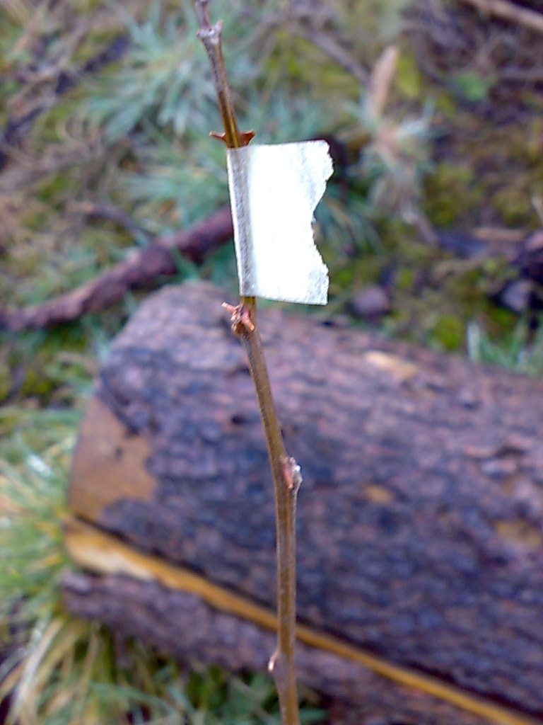 Vielerorts stehen in den Boden gerammte Holzlatten mit roter oder gelber Markierung. Rund herum um diese stehen Pflänzchen mit kleinen Fahnen, leider steht auf denen nichts drauf.