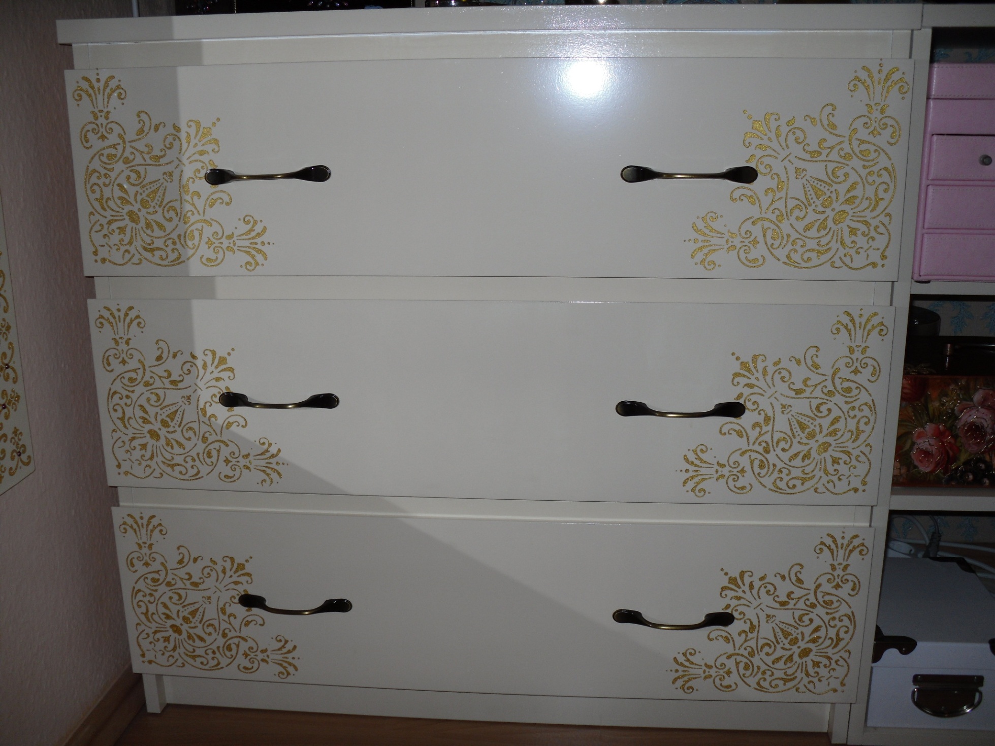 Da zeig ich euch auch gleich meine Ikeakommoden, die waren ursprünglich eifach weiß, ohne Griffe und Farbe. Jetzt stehen die bei mir im Schlafzimmer.