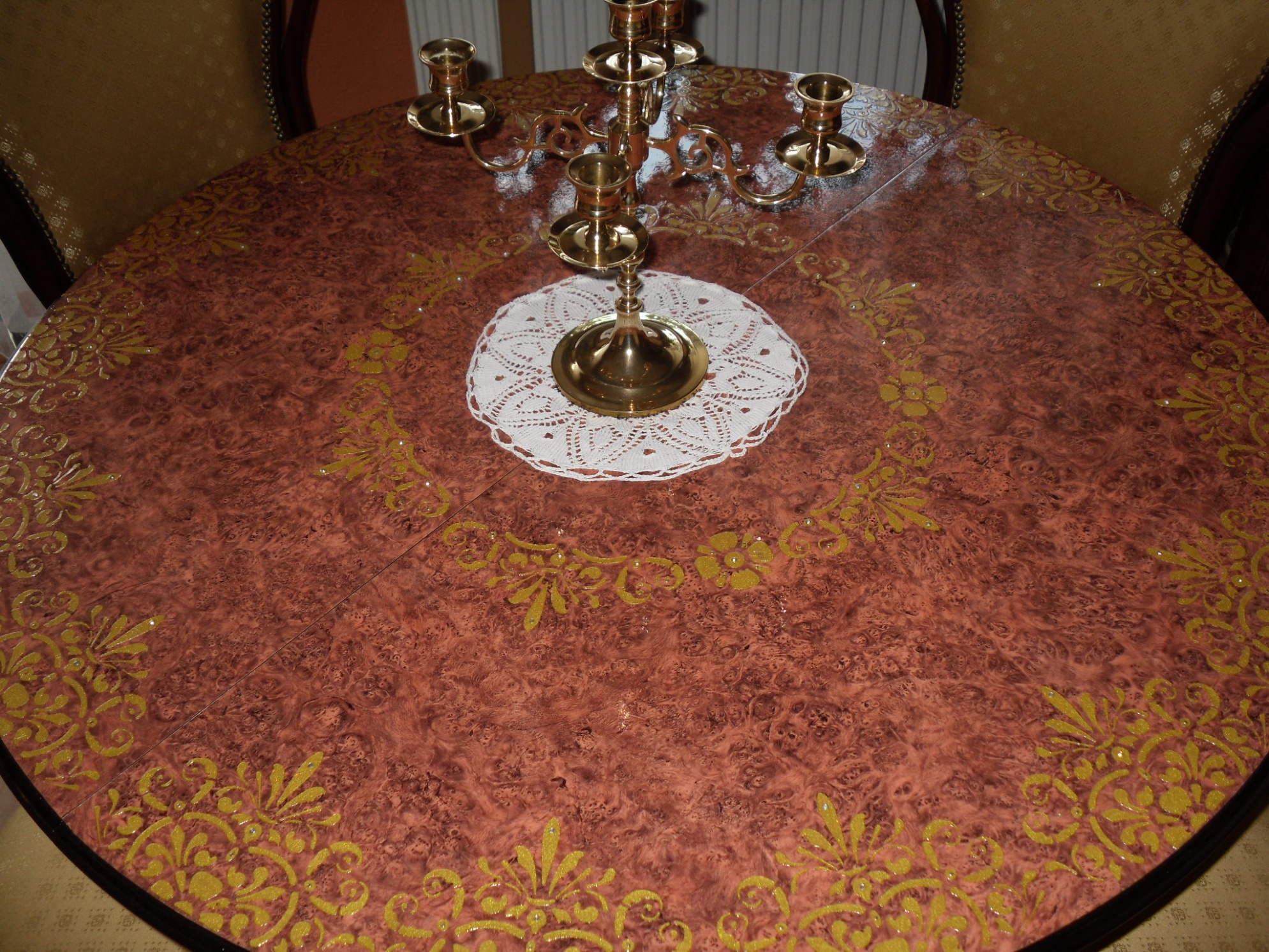 Das habe ich alles mit Wurzelholzfolie beklebt mit Goldstrukturpaste und Schablone bearbeitet und anschließend einen zwei Komponenten Lack drauf. Bei dem Blumentisch habe ich noch Messingteile eingearbeitet. Restgestell mit schwarzer Lackfarbe angemalt. Natürlich auch alles neu verschraubt und verleimt was wacklig war.