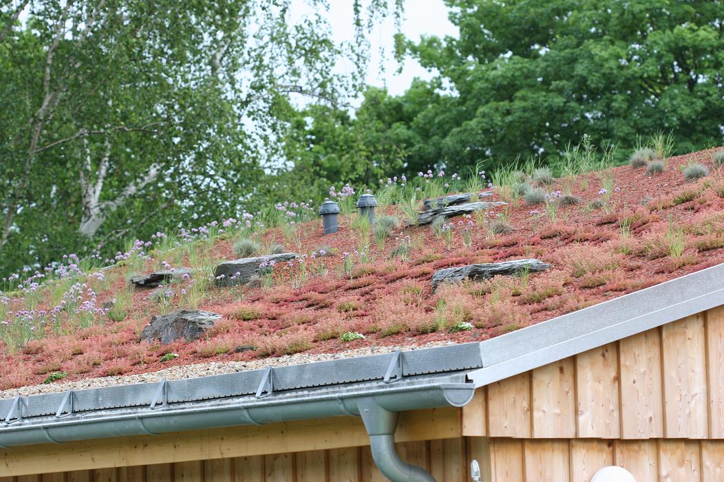 Wer unter einem Flachdach wohnt, hat dieses Phänomen selbst schon erlebt: An heißen Sommertagen wird es dort unerträglich heiß. Die Temperatur des mit Kies abgedeckten Flachdaches klettert mühelos auf 50° C. Noch schlimmer wird die Temperatur beim Dach, das nur durch schwarze Bitumenpappe geschützt ist. Hier steigt das Thermometer sogar bis auf 90° C. Nur eine dicke Isolierung schützt die Räume direkt unter dem Dach vor der unerträglichen Hitze. Beim Gründach ist das anders. Selbst wenn Pflanzen, Erde und Dränageschicht zusammen nicht dicker als 14 cm sind, erreicht die Temperatur des Daches nur angenehme 20 bis 25° C. Ein Hitzestau, wie er bei den anderen Dächern die Regel ist, tritt hier nicht auf.