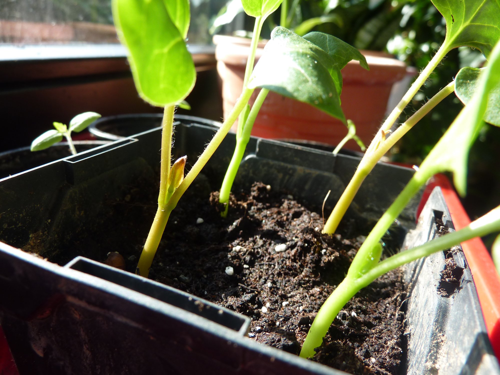 Ich habe auch schon 3 gesät; sehen auch alle gut aus. Als ich zwei neulich in seperate Töpfe umpflanzen wollte, hab ich wahrscheinlich die Wurzeln von einer beschädigt. Eine halbe Stunde später hing sie nämlich ganz schlaff runter, fast bis auf den Boden.