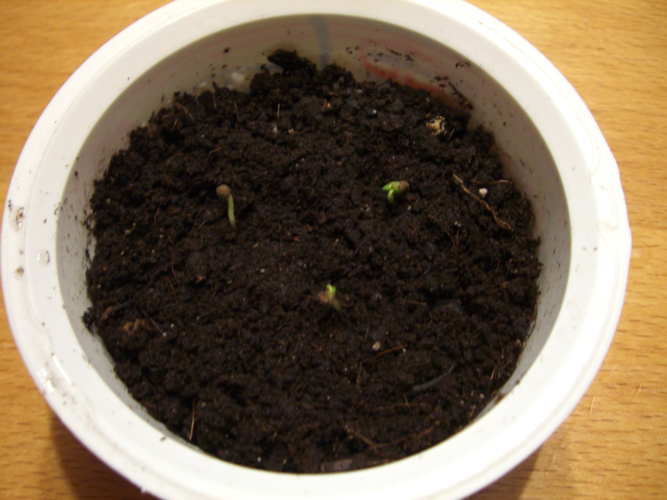 Ich hab sie gestern wieder aus der Erde gepult, weil alle 5 leichten Schimmel angesetzt haben, und ihnen ein Chinosolbad gegönnt (einen hab ich dann aussortiert der ist nicht mehr untergegangen). Und da ich sie dann schon einmal in den Fingern hatte hab ich mit einem Skalpell den spitz zulaufenden Teil der Samenkapsel abgesprengt. Heute Abend bei der "Keimkontrolle" hab ich gedacht ich seh nicht richtig bei den restlichen 4 Samen ist jeweils eine 2-3 mm lange Wurzel sehen.