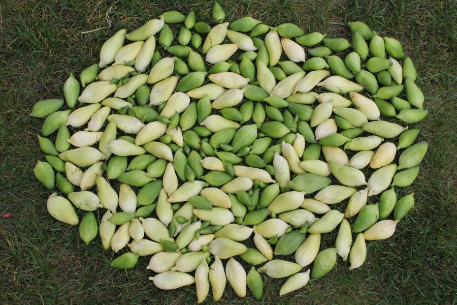 Nachdem der Nachtfrost (wir hatten -5°C in der Nacht vom Dienstag zum Mittwoch) die Inkagurke hinweggerafft hatte, heute die letzte Ernte an der verwelkten Pflanze: