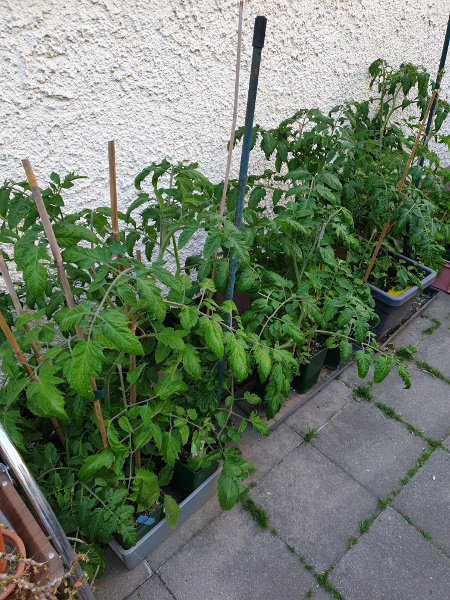 Ich habe zu viele Tomaten, die langsam in größere Kübel müssen – die Woche schaffe ich es hoffentlich, die Doktorchen ranzunehmen, nachdem sie mittlerweile vom Wintergarten ins Freiland gewandert sind.