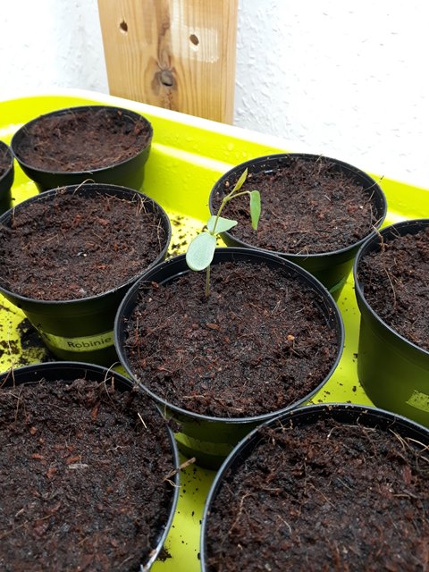 Mit der Robinie habe ich kein so großes Glück, da ist bisher nur eine von 10 gekeimt. Dafür geht's der einen aktuell sehr gut